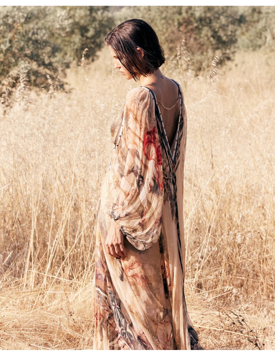 Las mangas largas y vaporosas, fruncidas en las muñecas con elástico y abiertas con una discreta hendidura, añaden feminidad y ligereza. En la espalda, dos paneles con volantes crean un movimiento poético y sorprendente. El vestido está totalmente forrado para mayor comodidad, logrando un equilibrio perfecto entre romanticismo, sofisticación y atrevimiento.