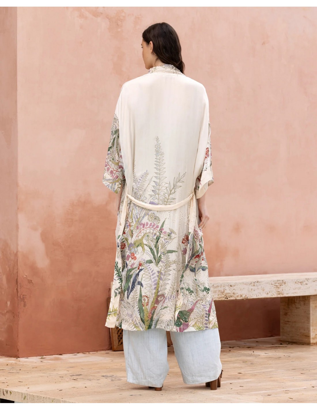 El tejido se enriquece con un sutil estampado floral y delicados detalles de broderie anglaise, que realzan la textura y aportan un encanto romántico. Además, el kimono incorpora un forro integrado que mantiene la ligereza sin perder opacidad, garantizando comodidad y fluidez. Una pieza pensada para mujeres que buscan un estilo desenfadado pero sofisticado, ideal para looks estivales con un toque artesanal.