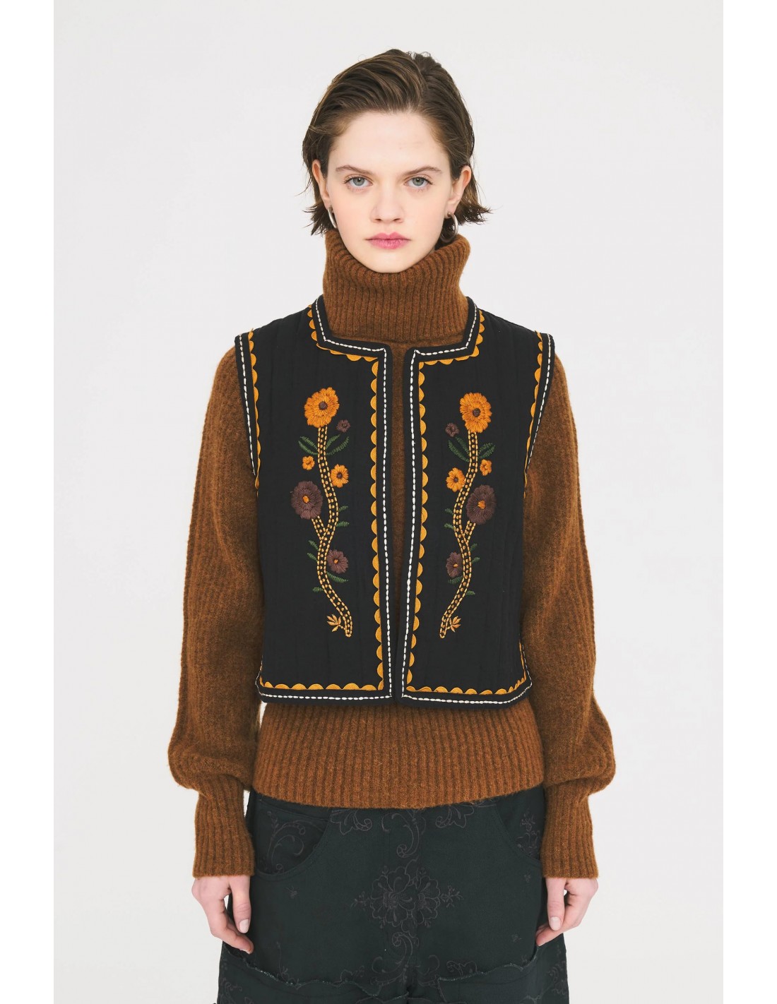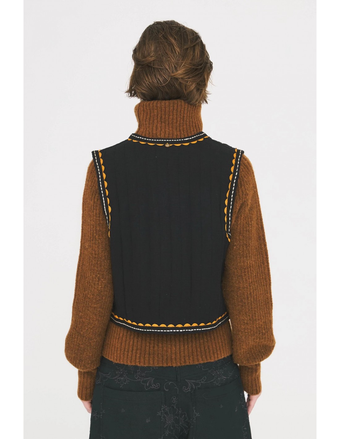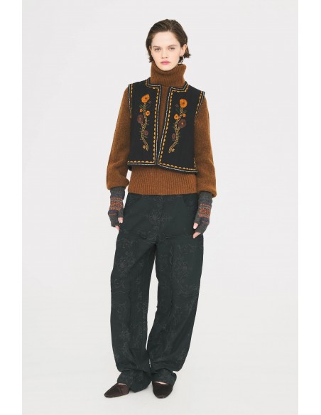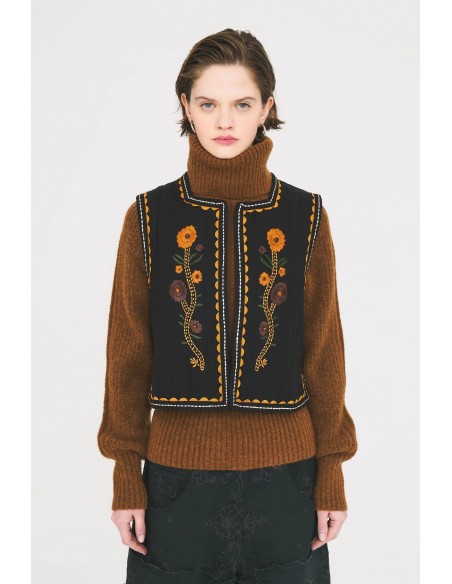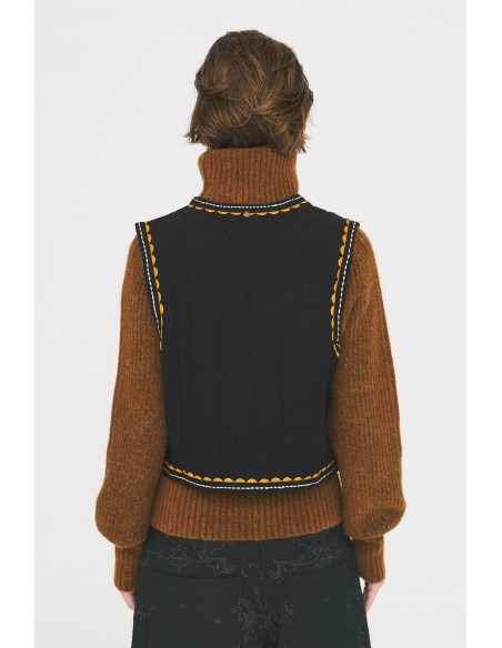 El Chaleco de Sol de Antik Batik es una prenda artesanal que combina tradición y modernidad. Confeccionado en crepé de algodón negro, destaca por su bordado a mano, que aporta textura y carácter. Su diseño sin mangas está realzado con apliques trenzados de algodón en la tapeta de botones y en las sisas, detalles que reflejan la atención al detalle y la inspiración étnica de la marca.