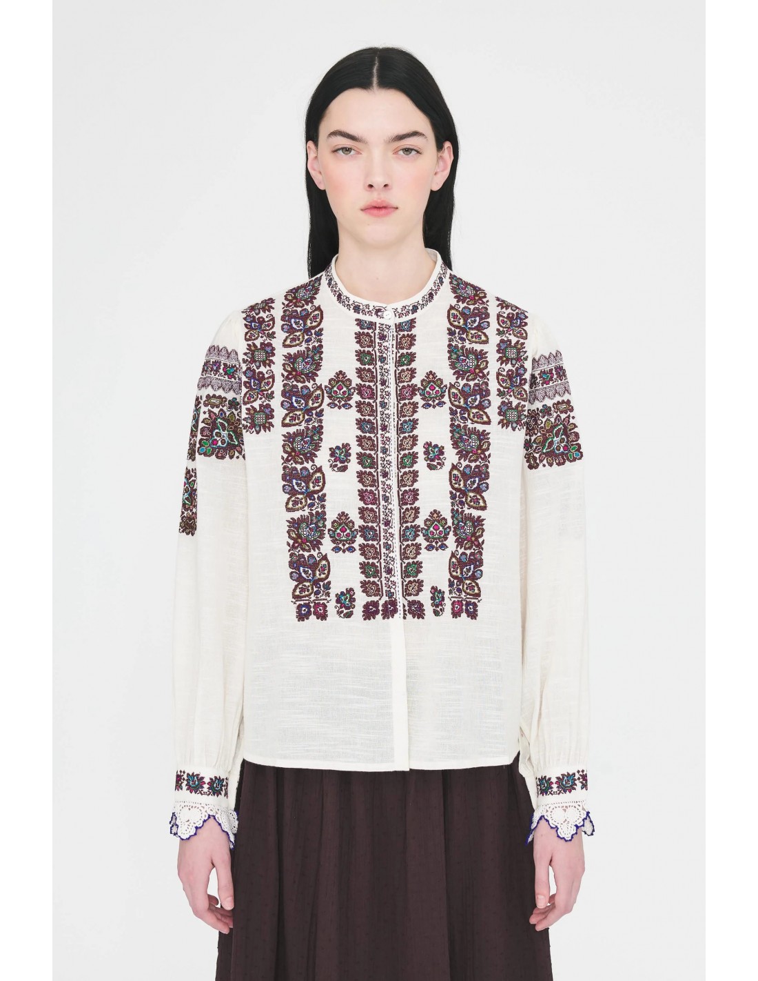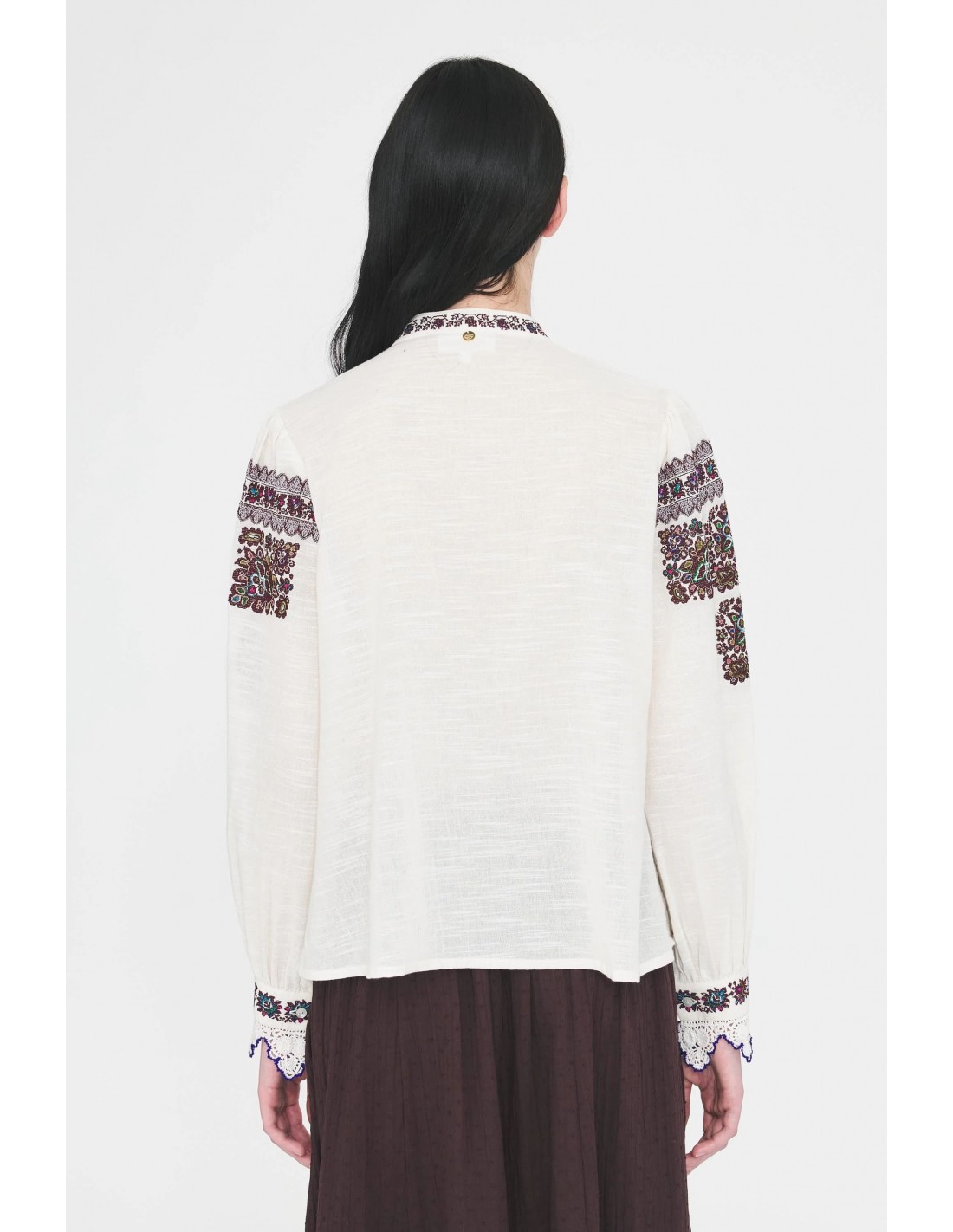 La Blusa Tami de Antik Batik es una prenda que celebra la tradición artesanal y el romanticismo bohemio. Confeccionada en 100% algodón crema, presenta un delicado bordado en punto de cruz inspirado en Hungría, que recorre la prenda con motivos llenos de carácter y autenticidad. Los puños con crochet aplicado a mano refuerzan la esencia artesanal y aportan un toque distintivo que convierte a esta blusa en una pieza única.