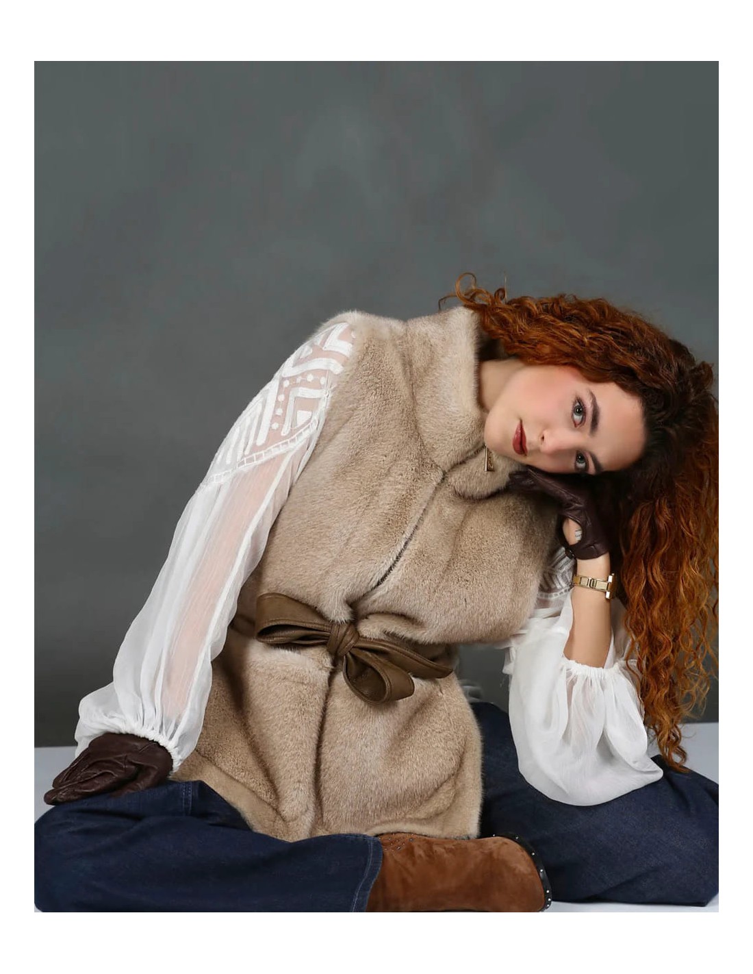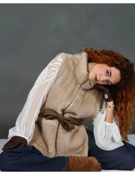 El Chaleco Eco Pelo Beige de Glox combina calidez, estilo y sofisticación artesanal. Confeccionado en eco pelo ultrasuave, presenta un cuello alto envolvente y cremallera bidireccional que permite adaptarlo a distintos looks.
