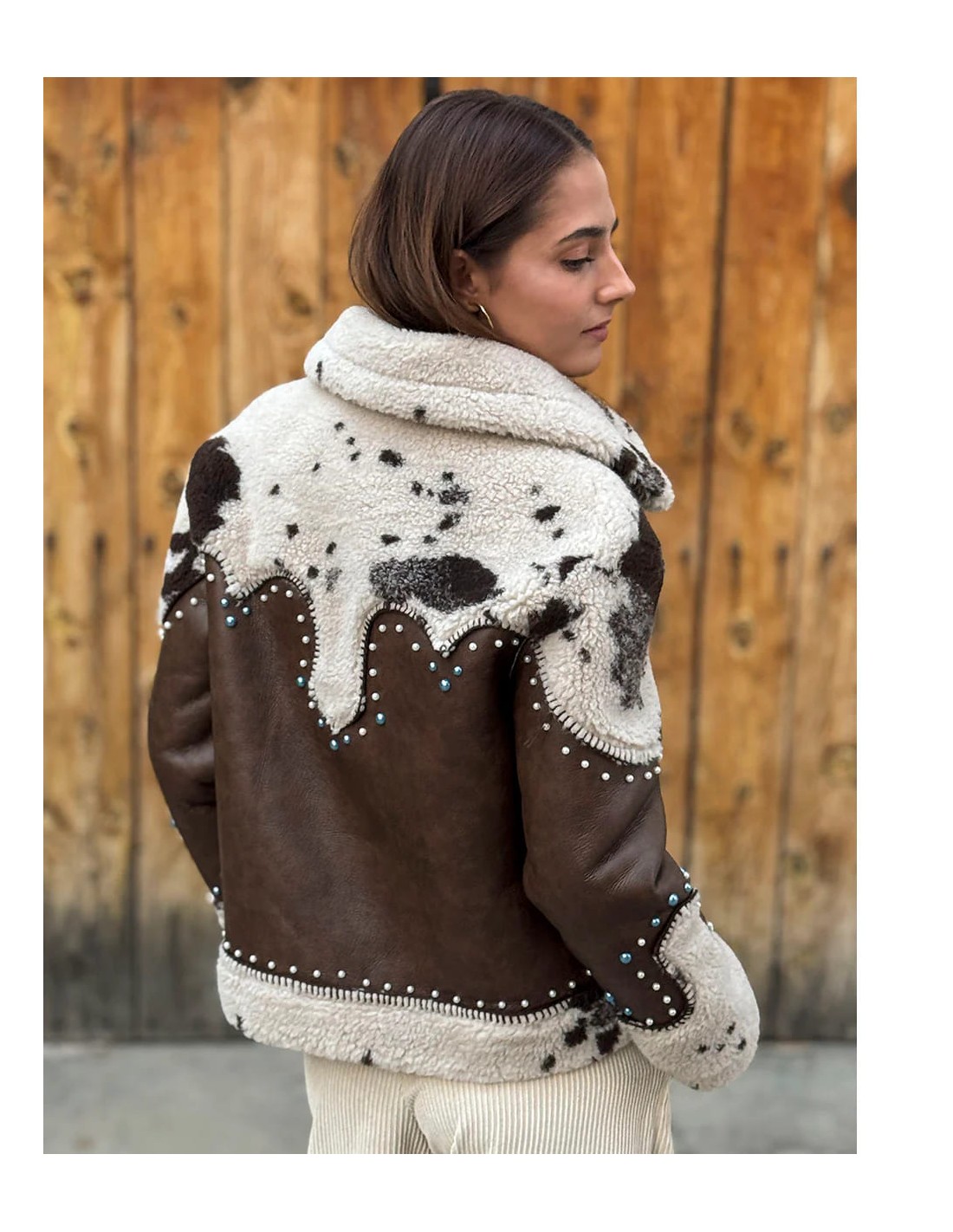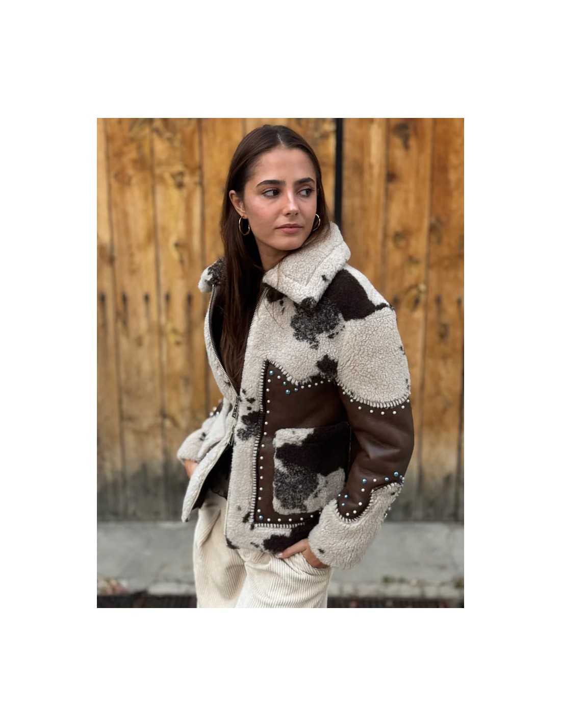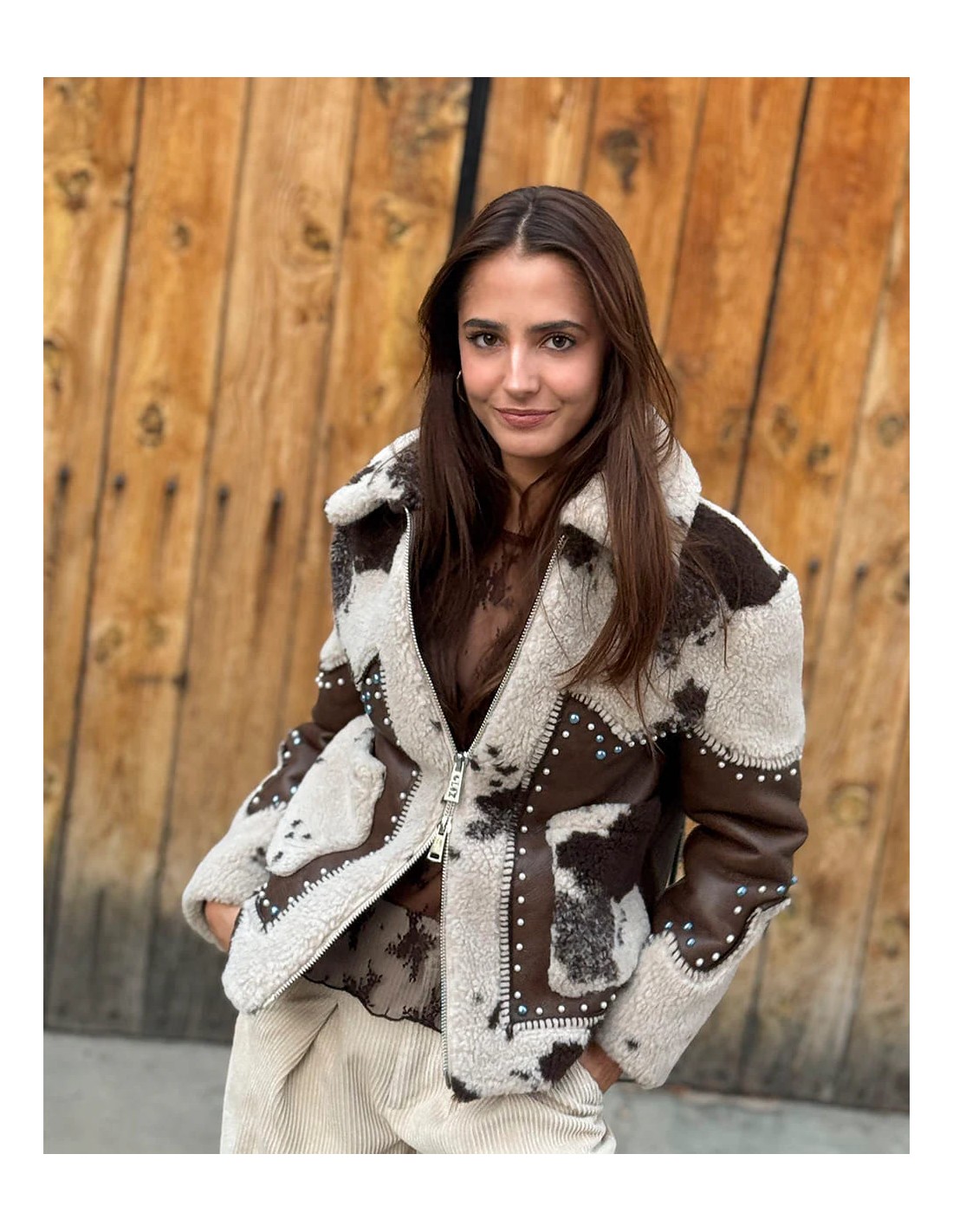 La Chaqueta Vaca Helena de Glox reinterpreta el estilo cowboy con un aire moderno y atrevido. Confeccionada en eco piel marrón chocolate y combinada con borreguillo estampado de manchas tipo vaca, esta prenda se convierte en un icono de personalidad y tendencia.