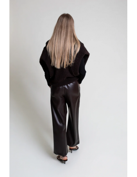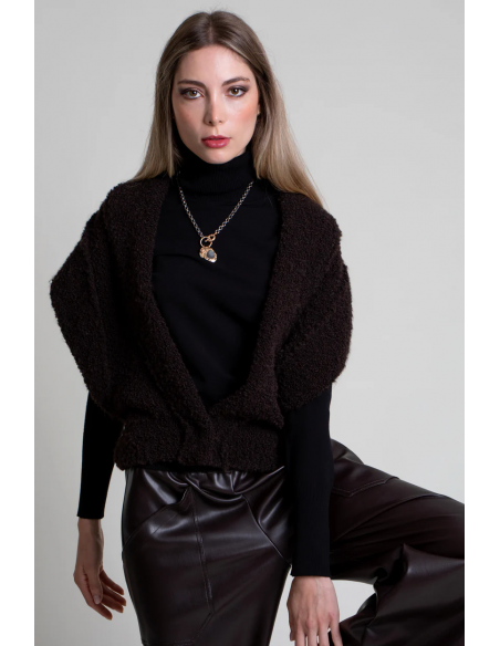 El Chaleco Cora de Pisonero es una pieza distintiva que combina estilo y modernidad. Confeccionado en punto bouclé, destaca por su escote pico, sus mangas cortas amplias y las costuras marcadas como adorno en escote y mangas, que aportan un toque contemporáneo. Su corte corto y el cierre delantero con broche metálico realzan su carácter sofisticado, convirtiéndolo en una prenda versátil para superponer sobre camisas, blusas o vestidos. Ideal para quienes buscan un chaleco moderno con un aire elegante y funcional.