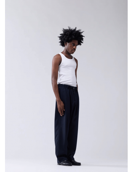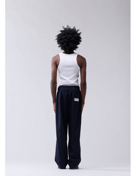 Los Wool Work Trousers Night de New Amsterdam combinan comodidad, funcionalidad y estilo contemporáneo en un pantalón unisex de corte relajado. Con cintura elástica con cordón ajustable y pierna recta, ofrecen libertad de movimiento y ajuste adaptable a distintas siluetas.