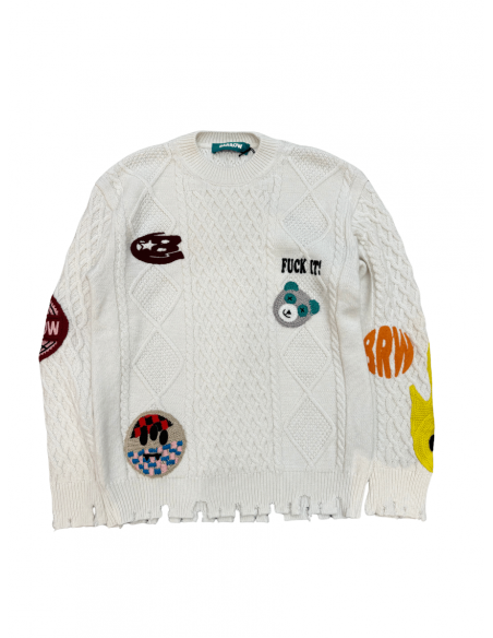 El Jersey Ochos Bordados de Barrow reinterpreta el clásico punto de inspiración artesanal con un toque rebelde y contemporáneo. Confeccionado en un suave punto trenzado de color blanco, este diseño destaca por los parches multicolor bordados a contraste, sello distintivo del universo gráfico de la marca. Su silhouette oversize y caída relajada aportan comodidad y estilo, ideal para looks urbanos con carácter. Los acabados acanalados en cuello, puños y bajo completan un diseño que combina tradición, creatividad y streetwear de autor.