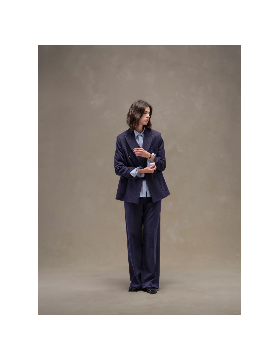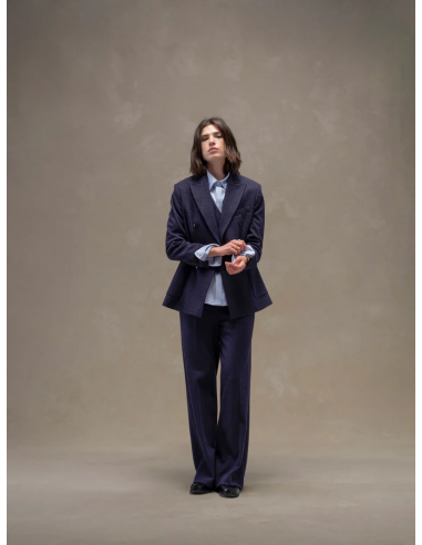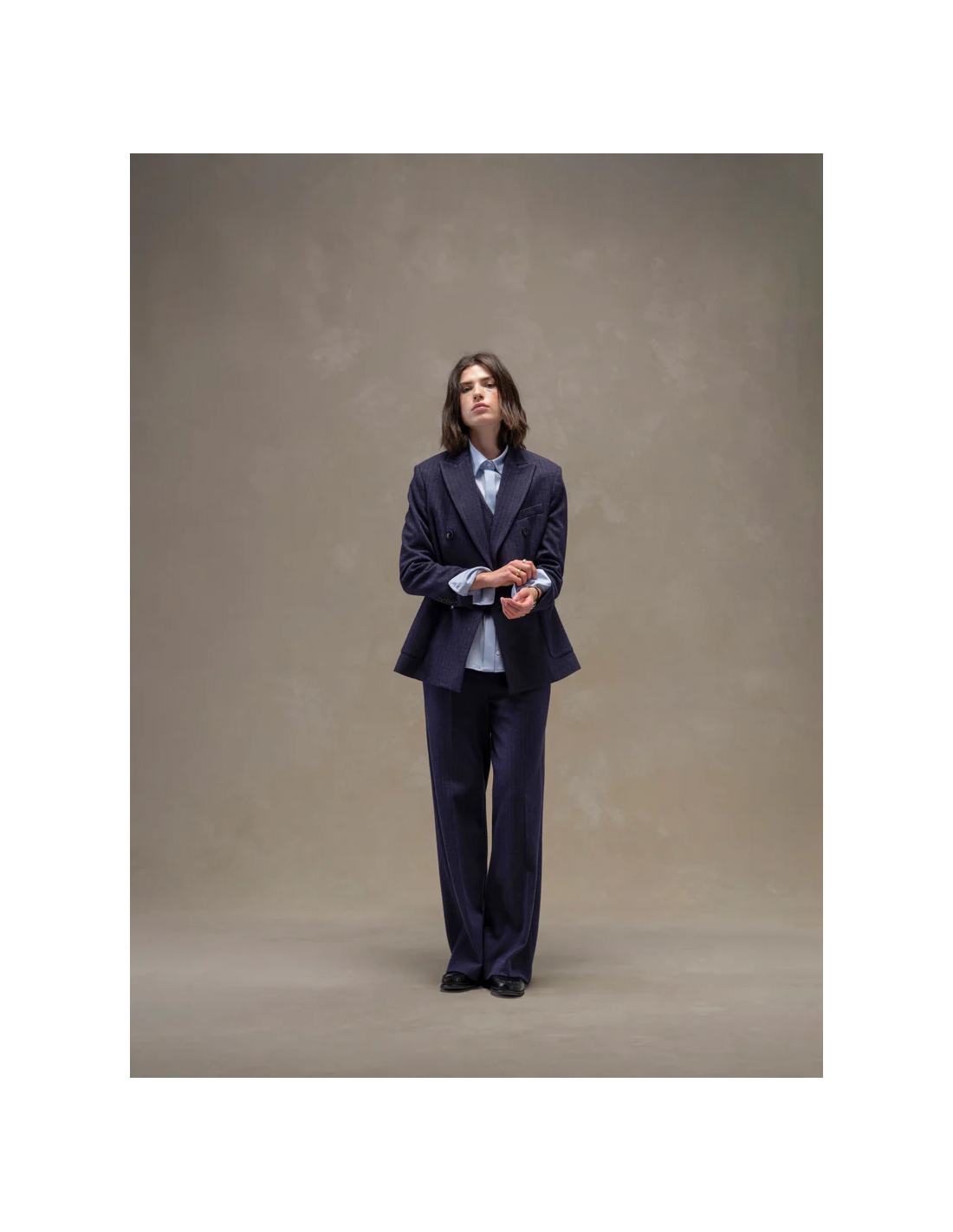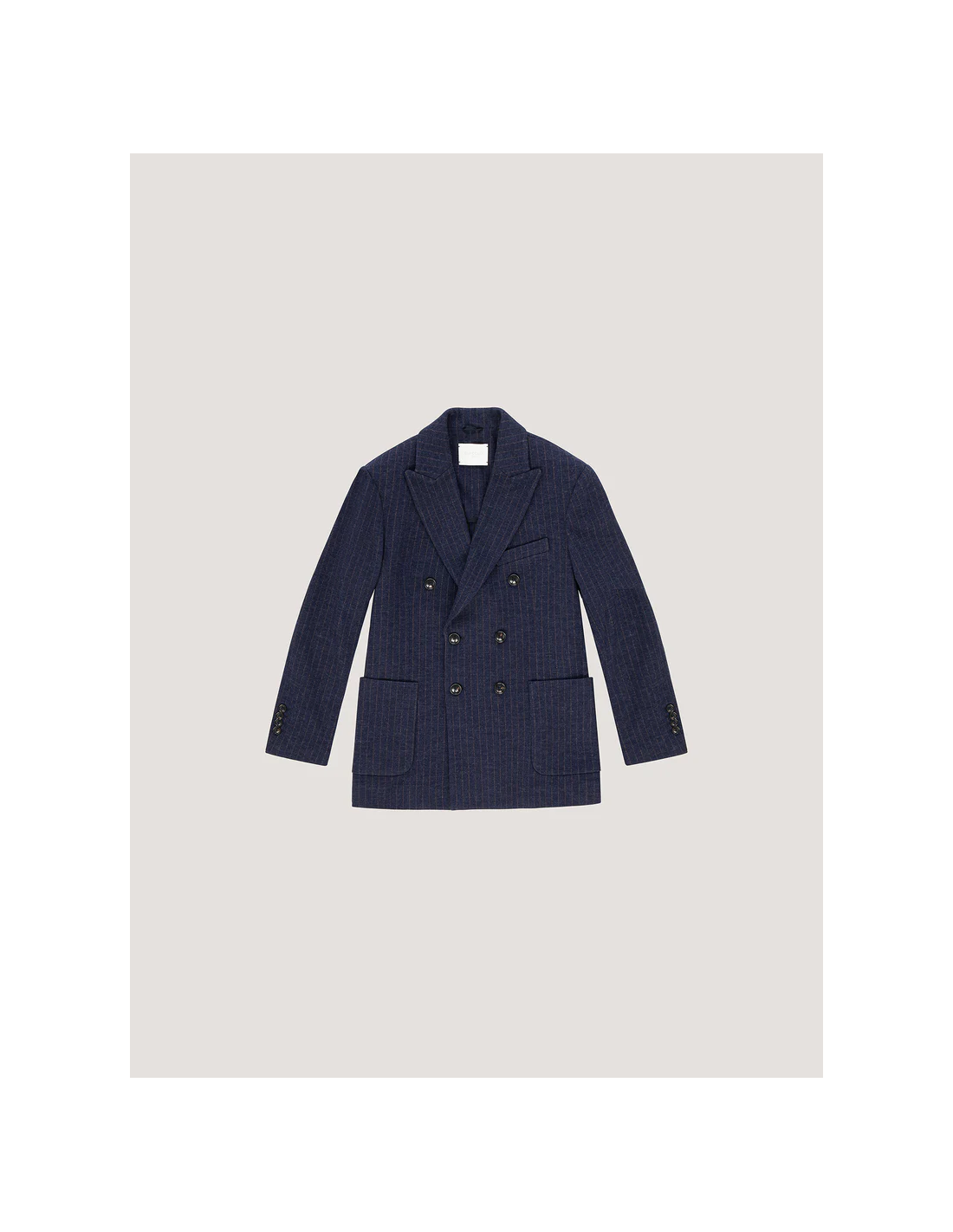 Su diseño de doble botonadura con solapas pico resalta la silueta masculina, mientras que los seis botones frontales y los puños con botones aportan un toque tradicional y refinado. Incluye dos bolsillos tipo patch y un bolsillo de ojal para funcionalidad y practicidad sin sacrificar el estilo.