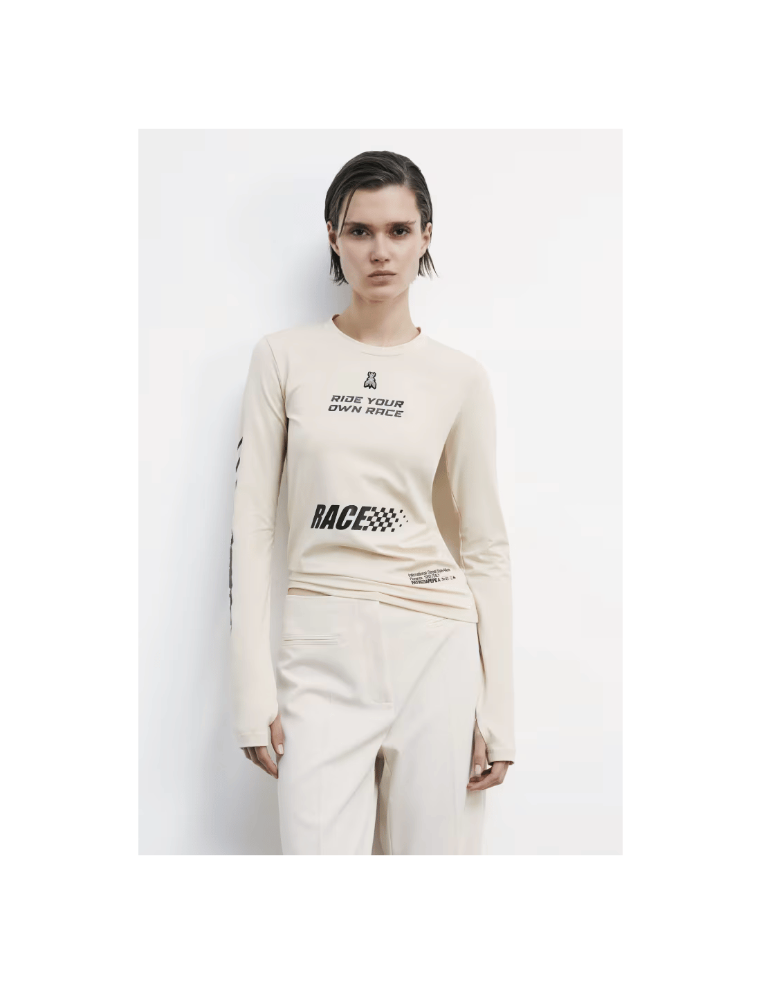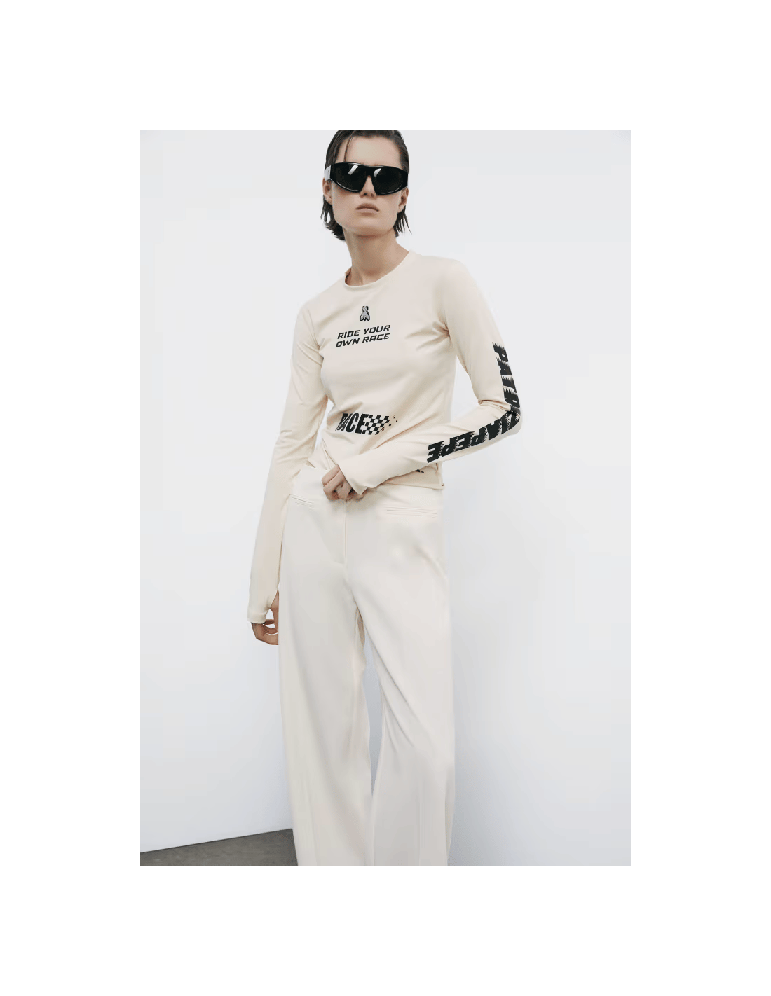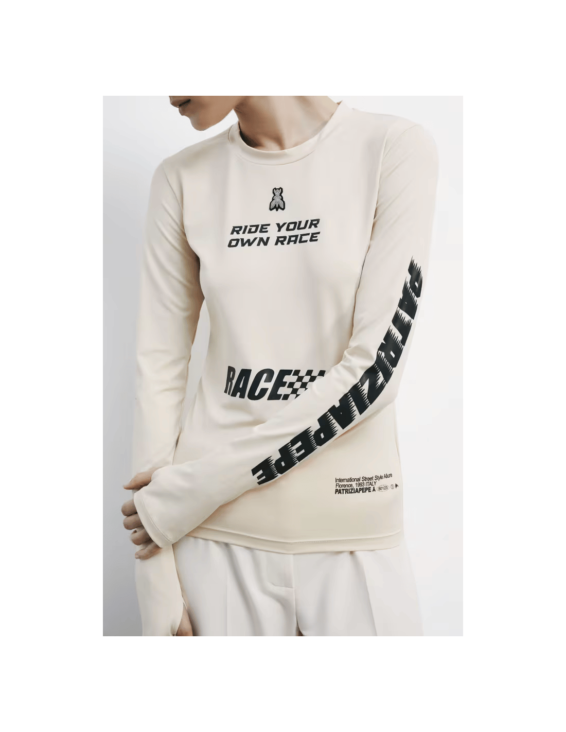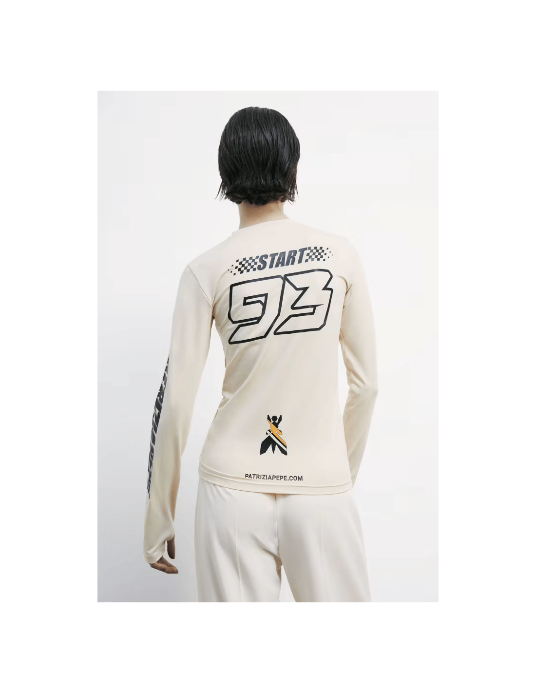 El Top Manga Larga Racing de Patrizia Pepe combina técnica y estilo con un tejido elástico de poliéster que se adapta al cuerpo. Su corte ajustado, manga larga y escote redondo aportan comodidad y feminidad, mientras que los detalles estampados inspirados en el mundo biker y el logo Fly engomado en el frontal aportan carácter y modernidad. Ideal para looks new casual, fusionando elementos masculinos y la actitud audaz de Patrizia Pepe.