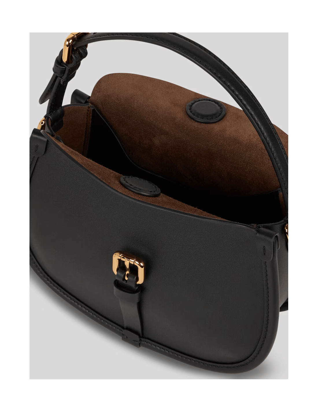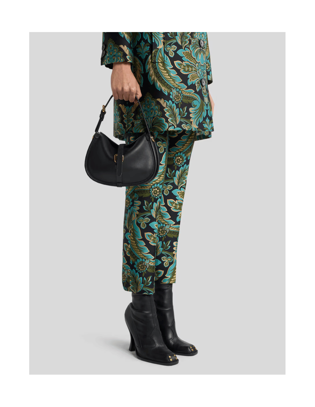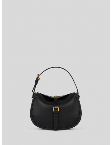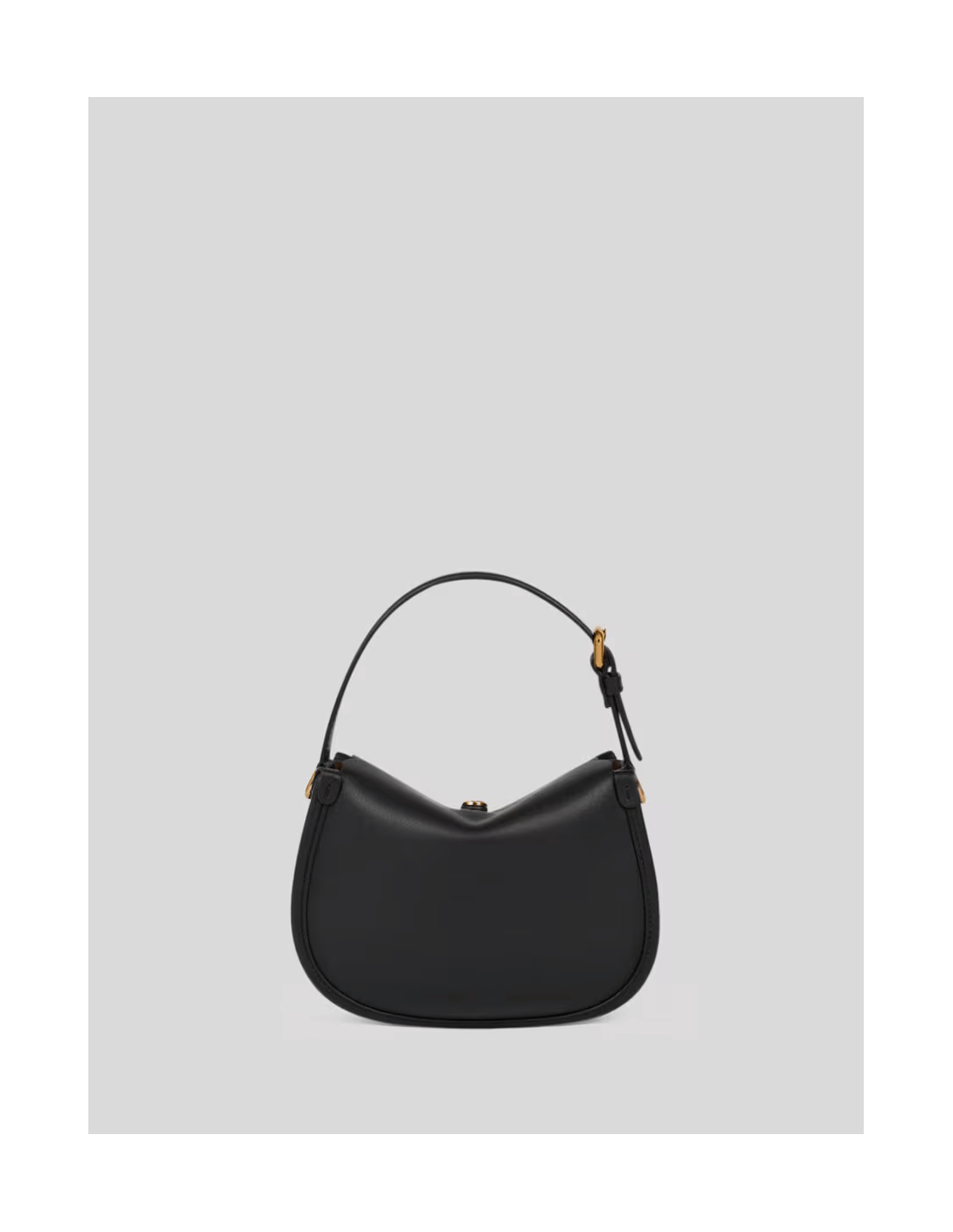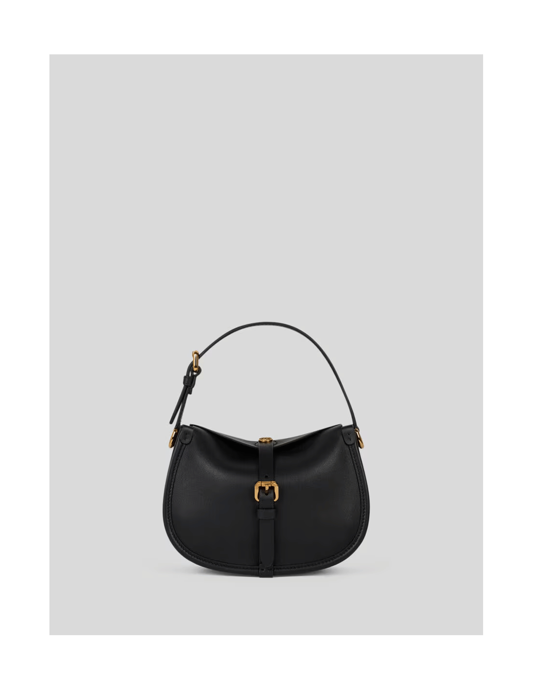 El bolso Pony pequeño negro de Etro reinterpreta la elegancia atemporal con un diseño de líneas fluidas y minimalistas. Confeccionado en piel de becerro de color liso, este modelo destaca por su doble sistema de cierre: un botón magnético decorado con el logo ETRO y el Pegaso grabado con la misma técnica utilizada en la acuñación de monedas, junto a una hebilla metálica funcional que refuerza su carácter artesanal. Presentado en el desfile otoño-invierno 2025, incorpora asa fija y correa extraíble, lo que permite llevarlo tanto al hombro como cruzado. Sus accesorios metálicos en acabado dorado aportan un toque de sofisticación a este bolso versátil, ideal para acompañar looks contemporáneos con un sello distintivo de la maison italiana.