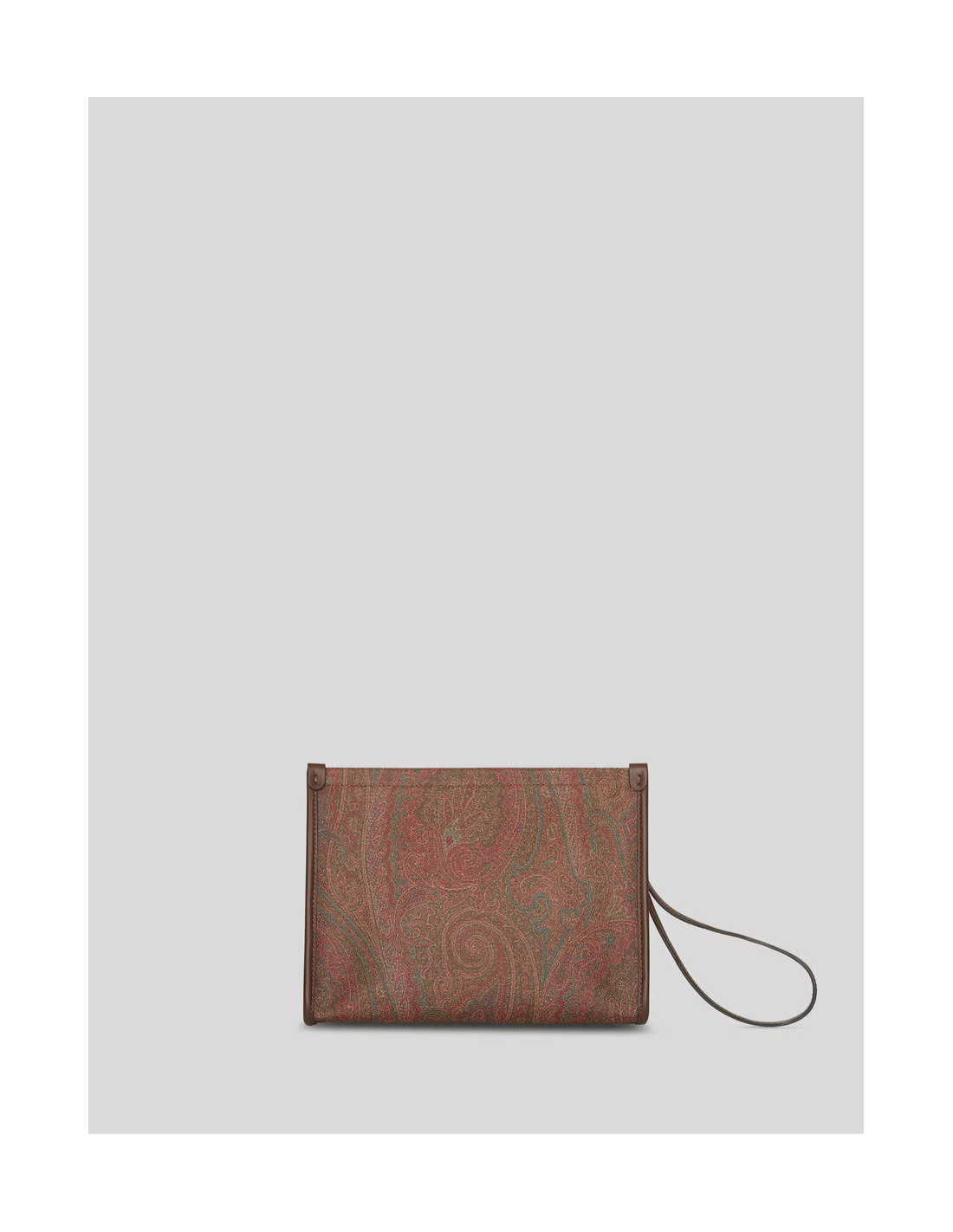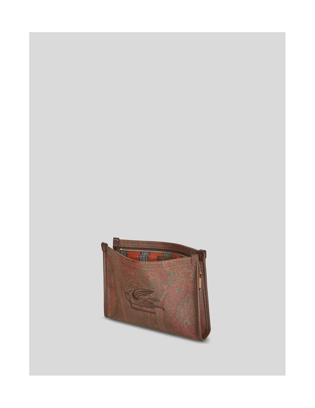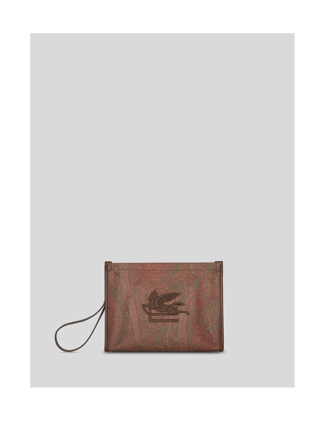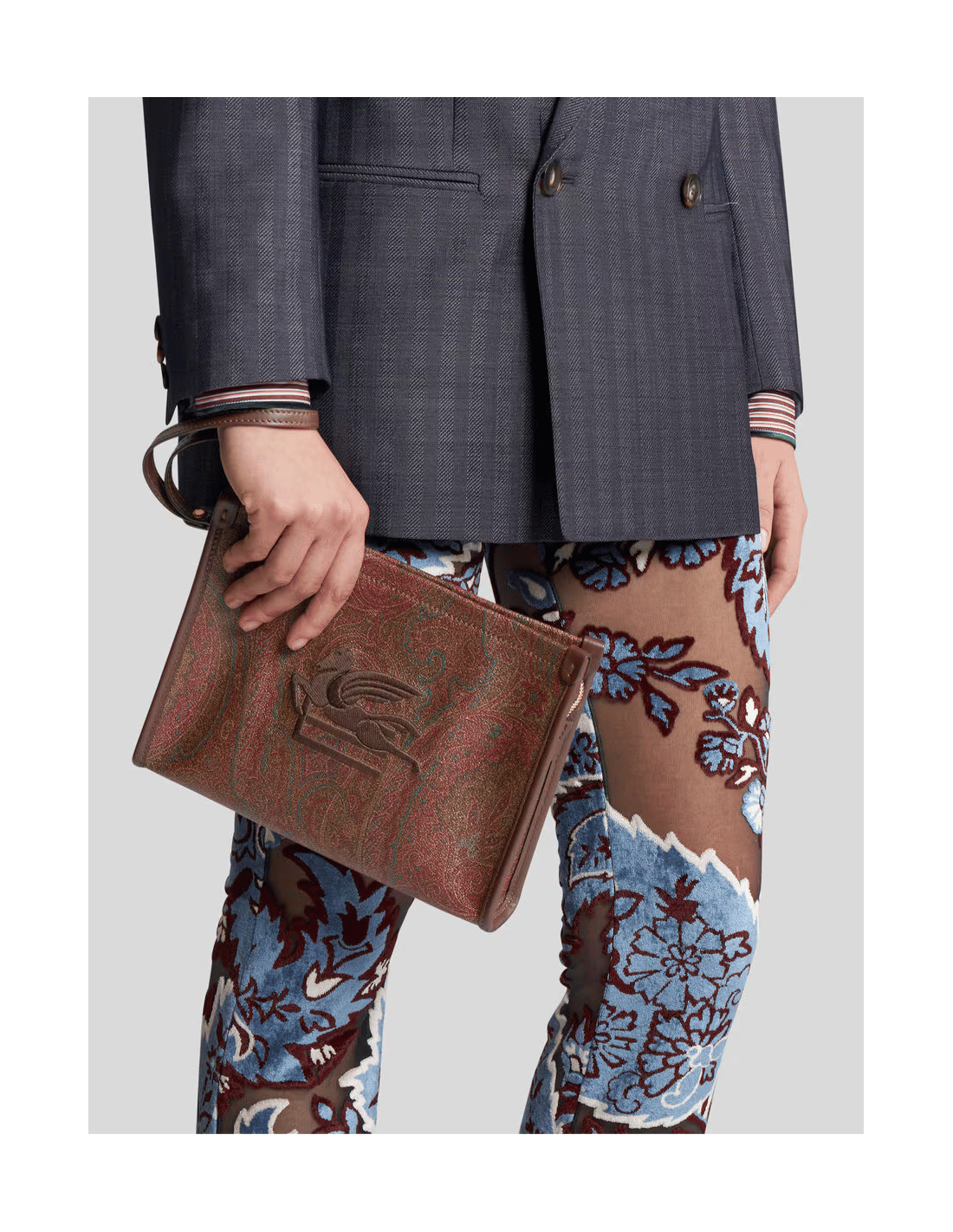 El Pouch Arnica mediano con Pegaso de Etro combina la elegancia artesanal italiana con el inconfundible estilo bohemio de la firma. Confeccionado en el icónico tejido Paisley jacquard, presenta un refinado bordado con los logos ETRO y Pegaso en la parte delantera, símbolo de la herencia y la creatividad de la marca. Los detalles de piel y los acabados metálicos dorados realzan su sofisticación, mientras que el forro interior en tejido jacquard a rayas aporta un contraste distintivo. Práctico y elegante, incorpora cierre con cremallera, correa de muñeca extraíble y un bolsillo interior aplicado, convirtiéndolo en el accesorio perfecto para llevar lo esencial con estilo.