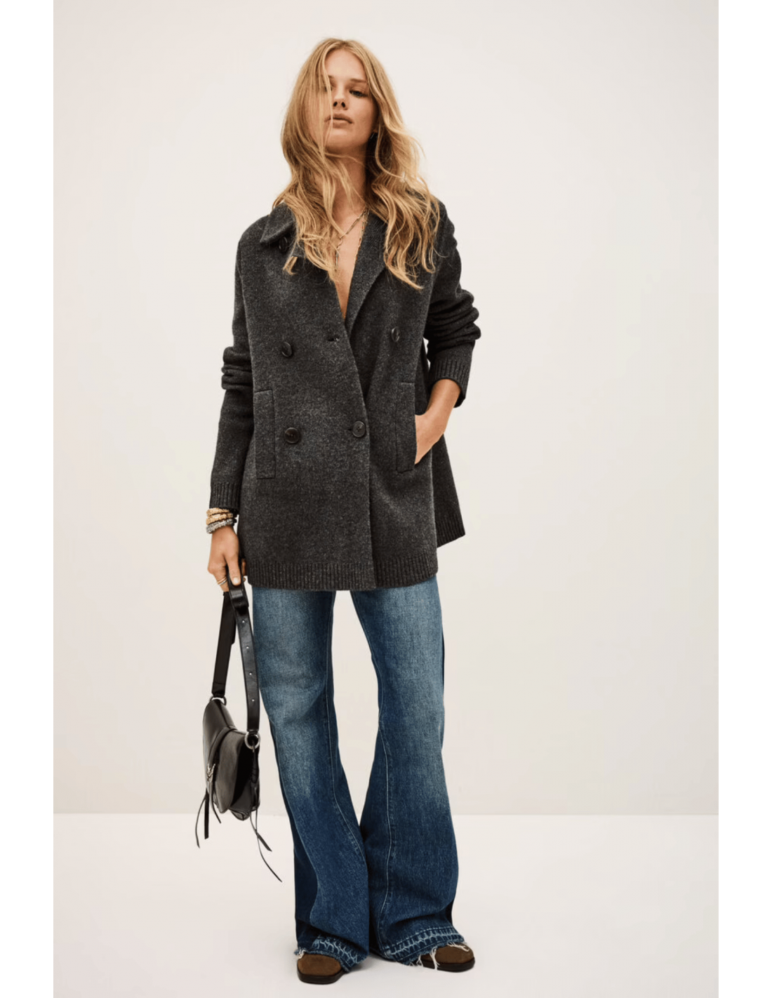 Presenta un cuello de doble capa, cierre de doble botonadura, mangas largas con corte acampanado y bolsillos ribeteados. En la espalda, un pliegue invertido añade movimiento y estructura al diseño.