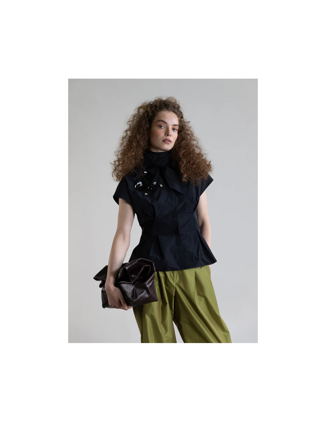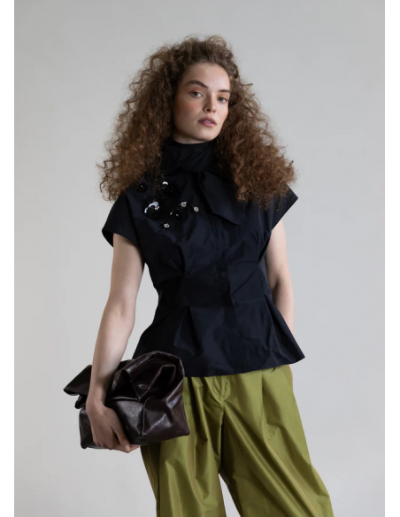 Top Cropped Fitted Shirt with Ring Collar & Sequin Floral Detail