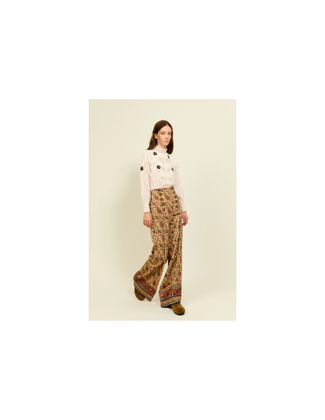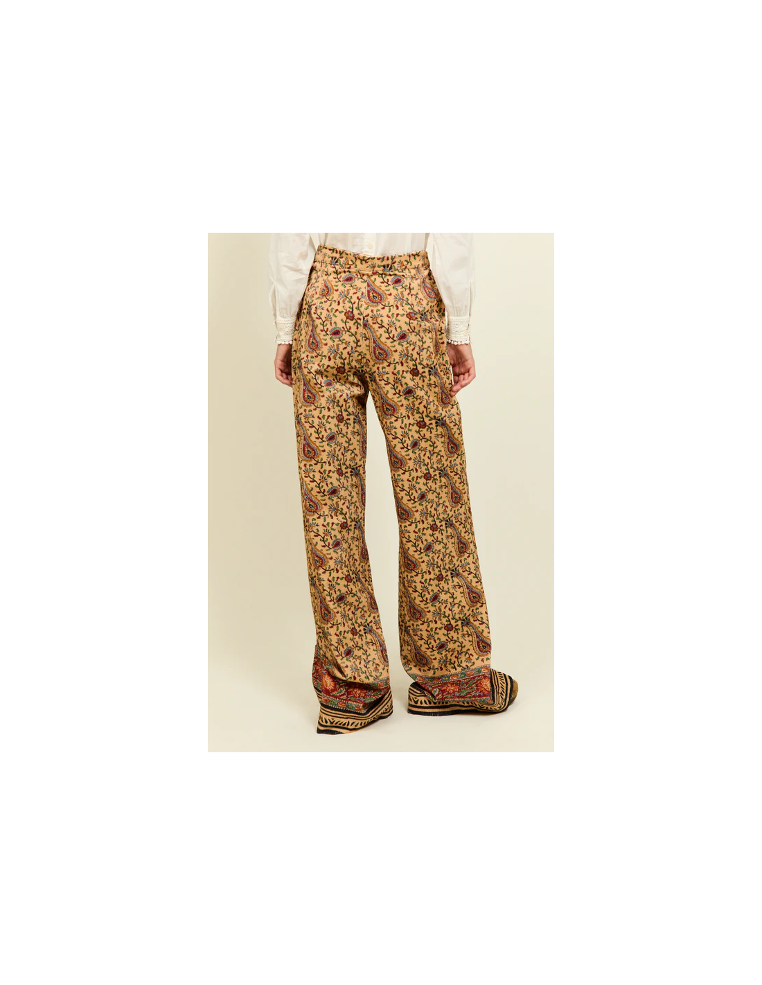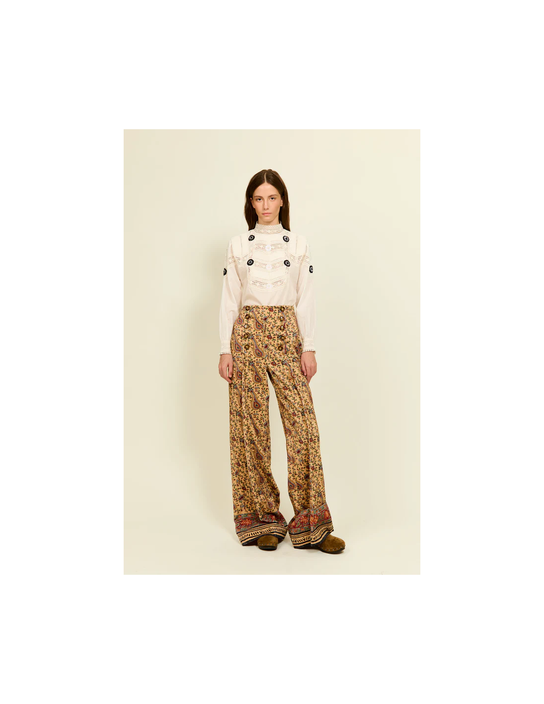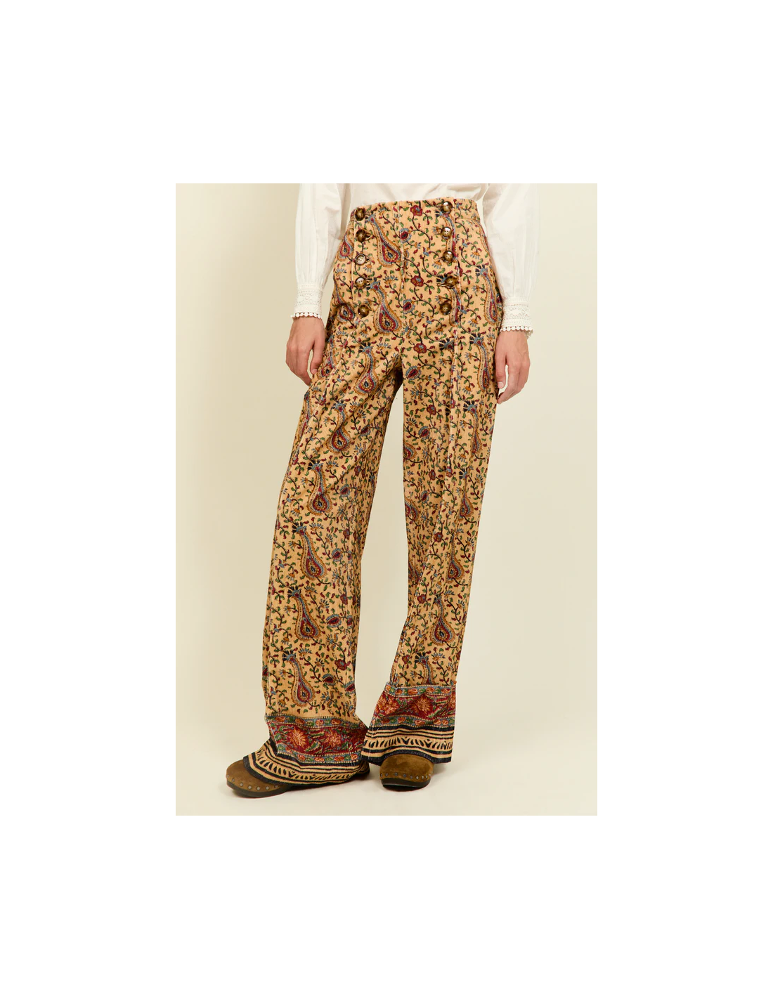 Confeccionados en 100% algodón, con un corte amplio y favorecedor que evoca la elegancia relajada de los años setenta. Su estampado paisley en tonos cálidos y detallados motivos florales aporta un aire bohemio y sofisticado. La cintura alta con doble hilera de botones resalta la silueta, mientras que el bajo con cenefa decorativa añade un toque artesanal característico de la marca. Una prenda versátil y con personalidad, perfecta para combinar con camisas de seda o chaquetas estructuradas.