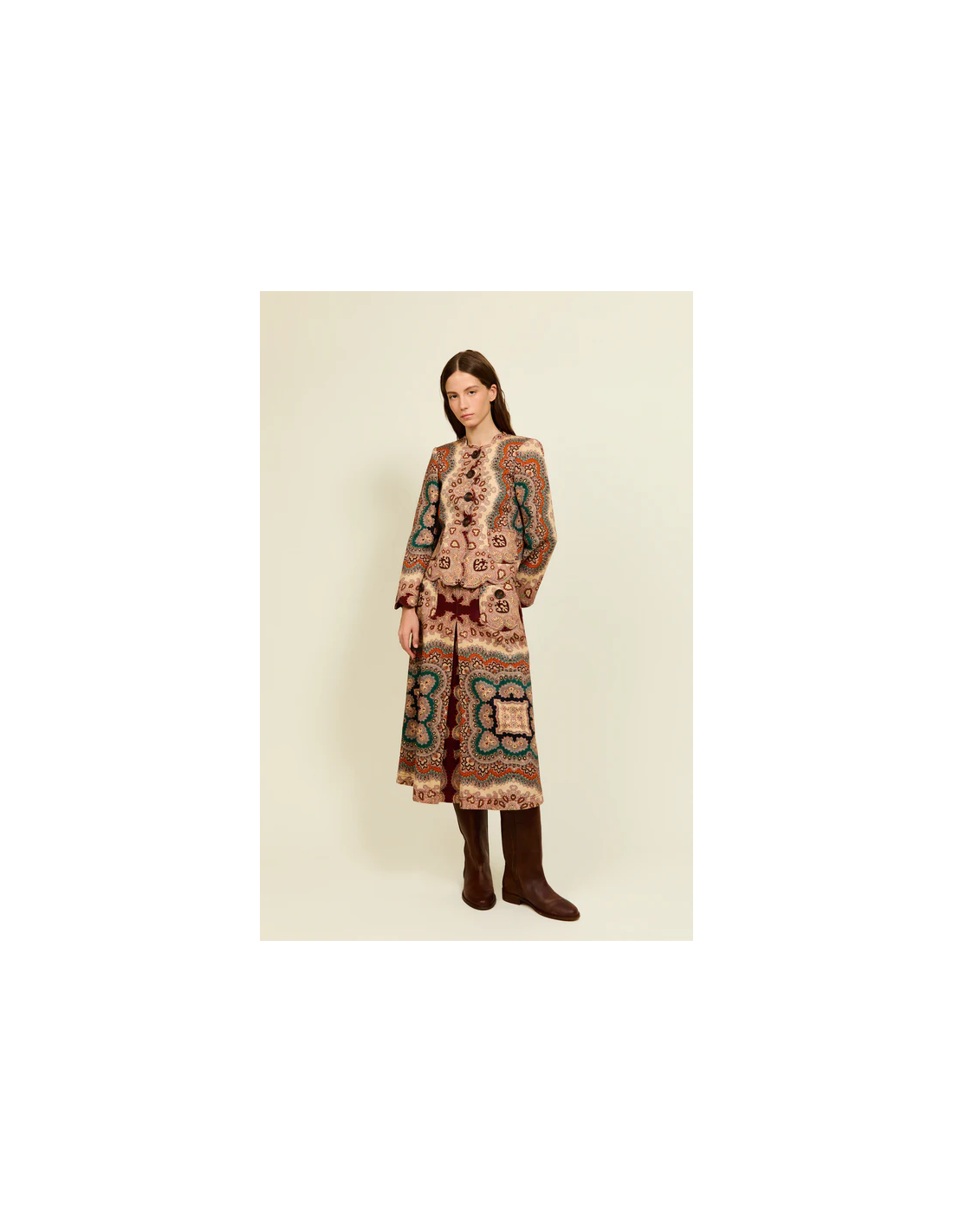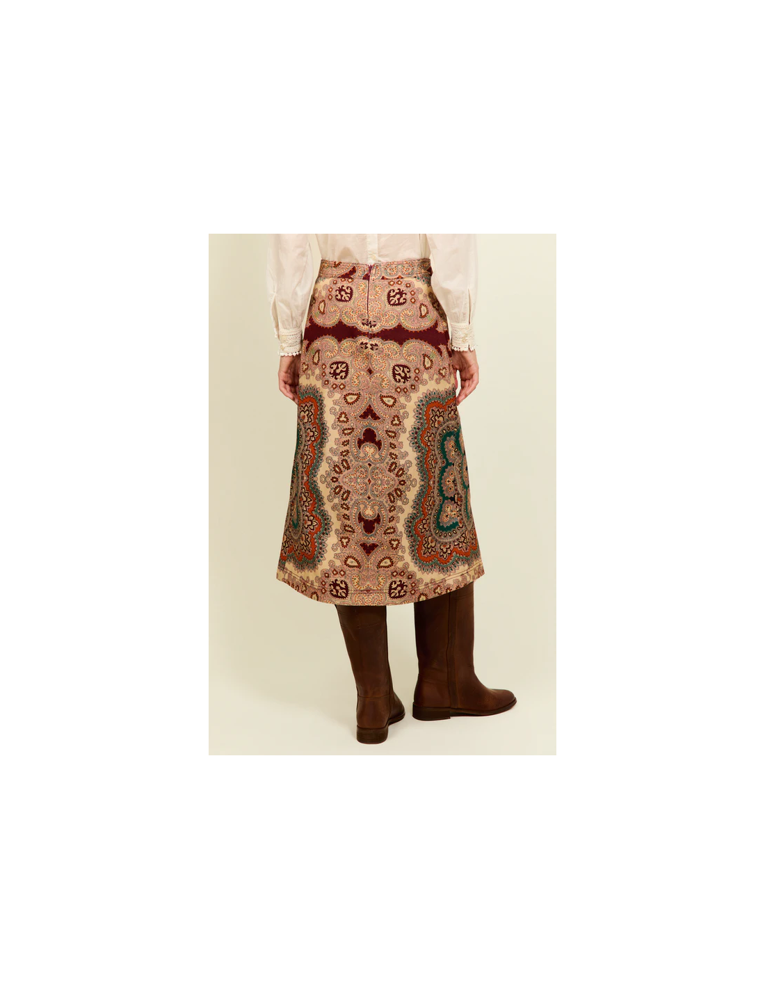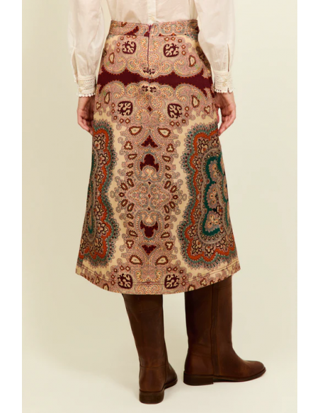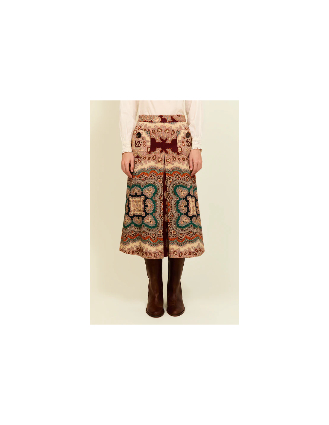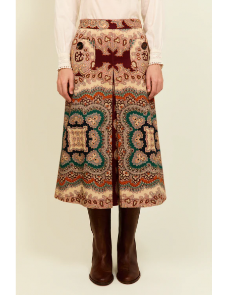 La falda midi Briar presenta un elegante motivo de inspiración tapiz en tonos cálidos de burdeos, verde y crema. De corte en línea A estructurada, incorpora bolsillos de parche con detalle de botones y una tabla central que aporta movimiento y forma. Confeccionada en un tejido suave pero con cuerpo, esta falda refleja una estética bohemia refinada que combina a la perfección con blusas, jerséis o botas altas para un look sofisticado y natural.