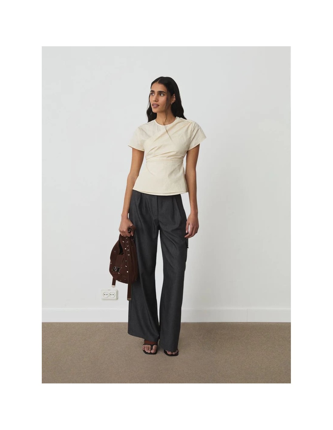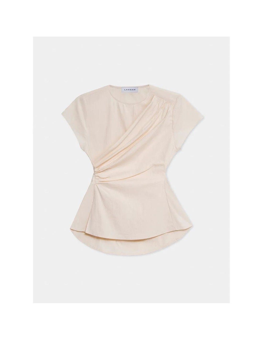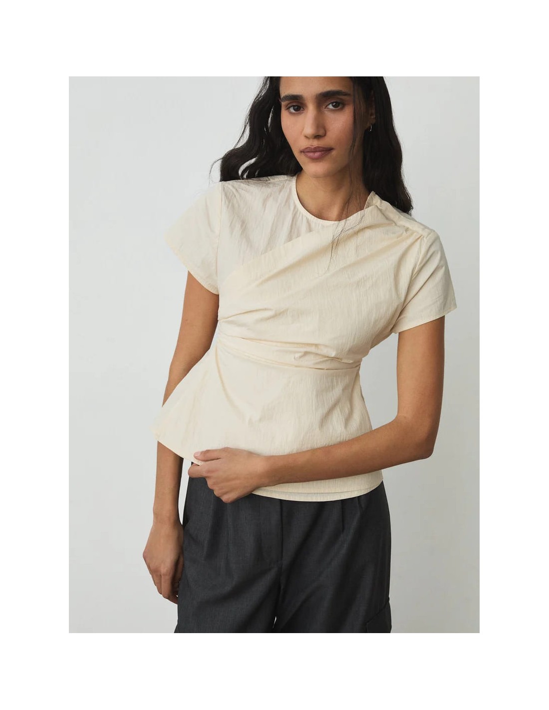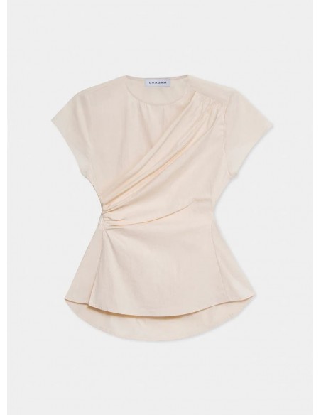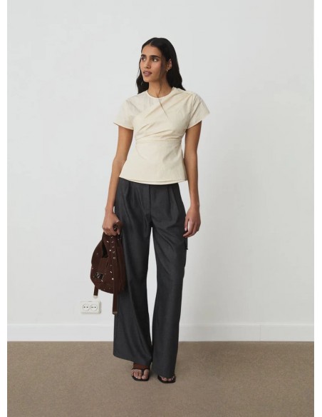 Blusa cruzada de manga corta para mujer con diseño elegante y femenino. Presenta cuello redondo y delicados detalles drapeados que aportan movimiento y sofisticación. El frente cruzado incorpora ribetes de cierre en los hombros que añaden un toque distintivo al diseño. La cintura elástica desde los laterales hasta la espalda estiliza la silueta y garantiza un ajuste cómodo. En la parte trasera, cuenta con una abertura central y una pieza inferior acampanada con fruncido que aporta fluidez y volumen. Una blusa versátil y favorecedora, perfecta para completar looks casuales o más sofisticados.