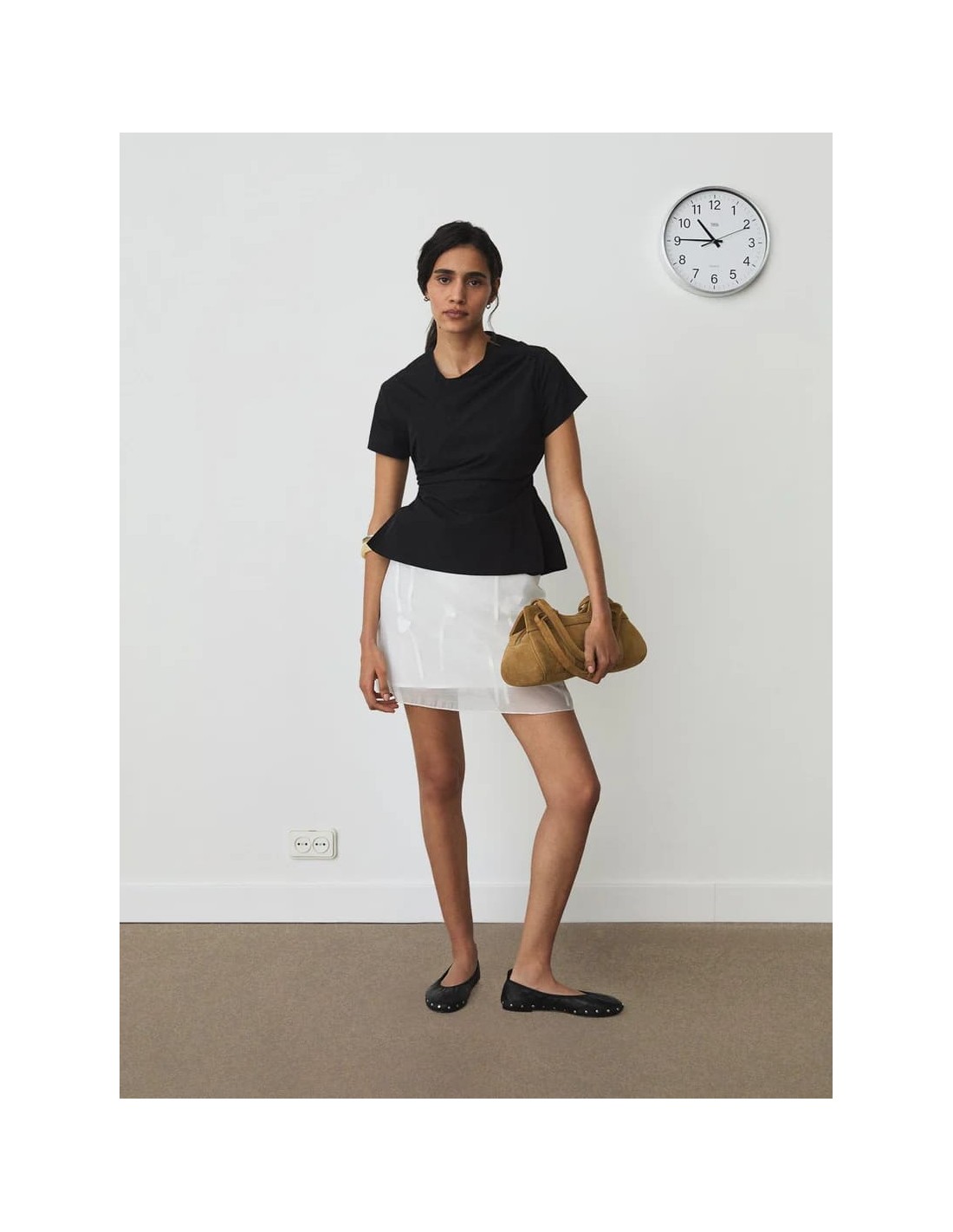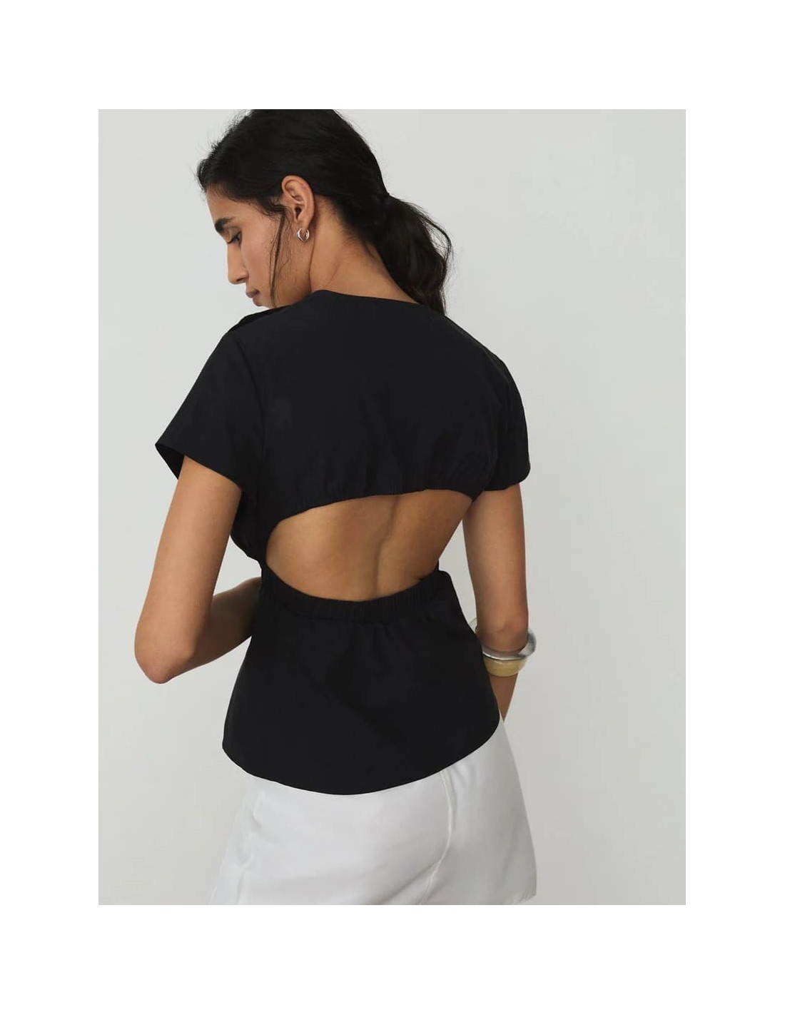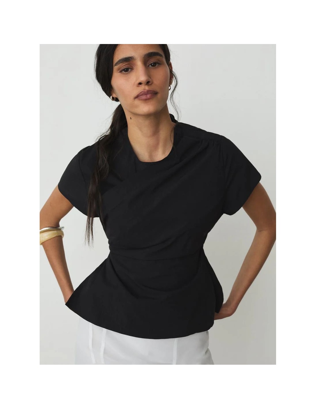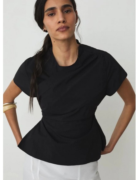 Blusa cruzada de manga corta para mujer con diseño elegante y femenino. Presenta cuello redondo y delicados detalles drapeados que aportan movimiento y sofisticación. El frente cruzado incorpora ribetes de cierre en los hombros que añaden un toque distintivo al diseño. La cintura elástica desde los laterales hasta la espalda estiliza la silueta y garantiza un ajuste cómodo. En la parte trasera, cuenta con una abertura central y una pieza inferior acampanada con fruncido que aporta fluidez y volumen. Una blusa versátil y favorecedora, perfecta para completar looks casuales o más sofisticados.