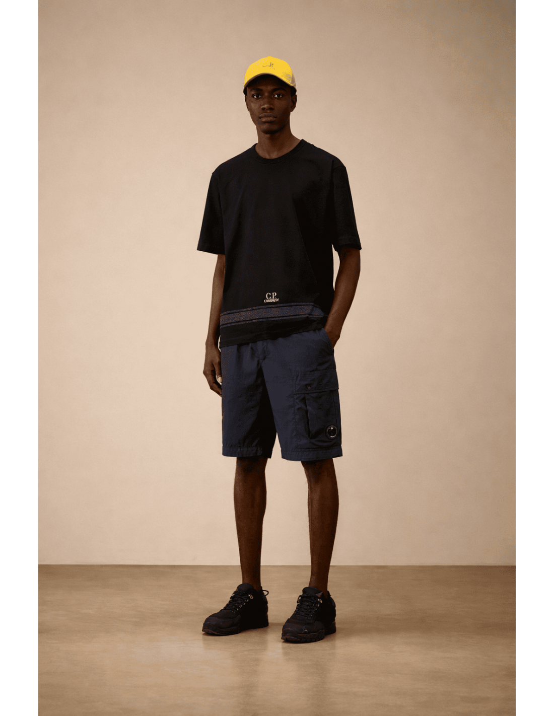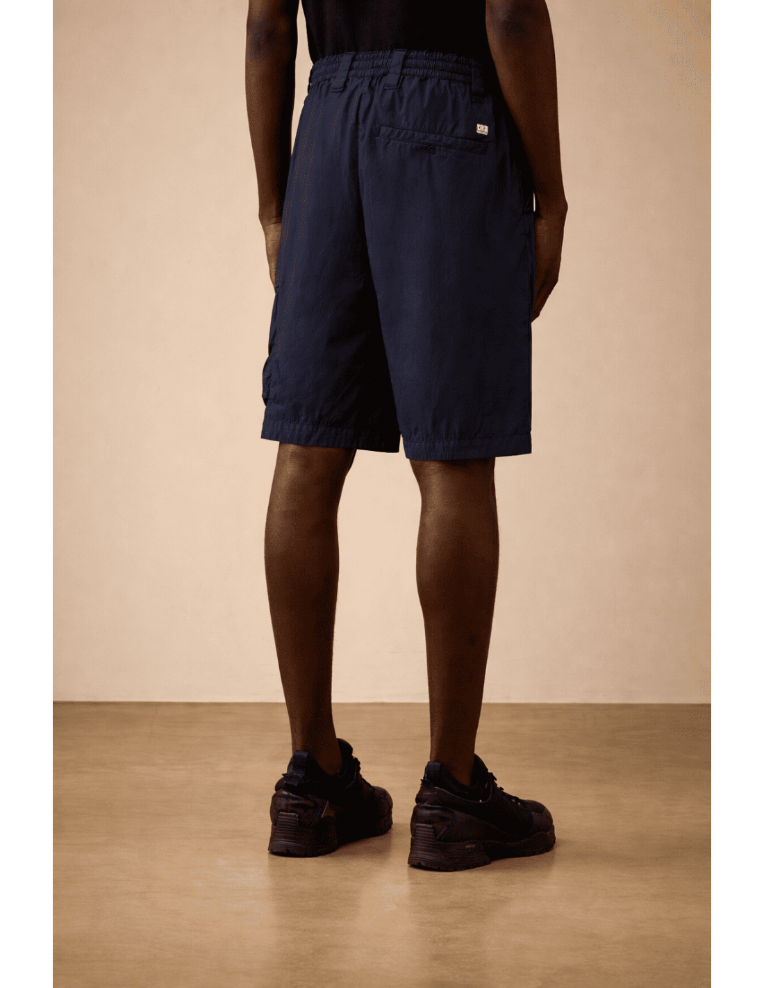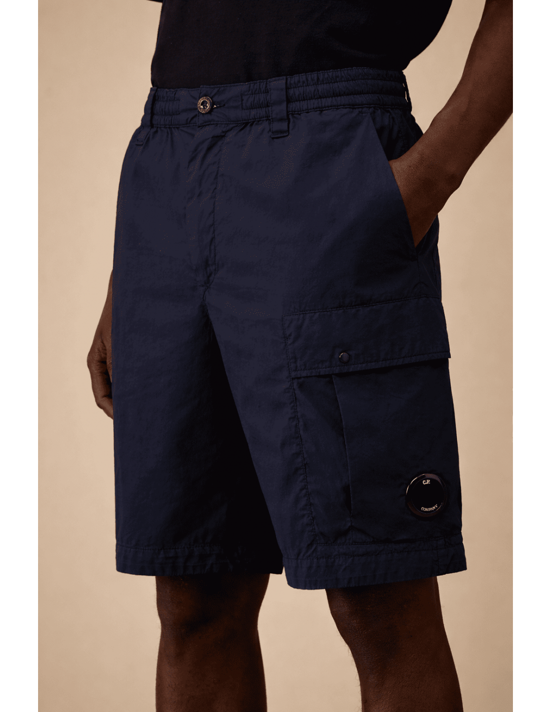 El diseño funcional se completa con múltiples bolsillos: bolsillos laterales, un bolsillo cargo con solapa y cierre a presión que incorpora la icónica lente CP Company, y un bolsillo trasero con solapa y etiqueta con logotipo, aportando identidad y carácter a la prenda.