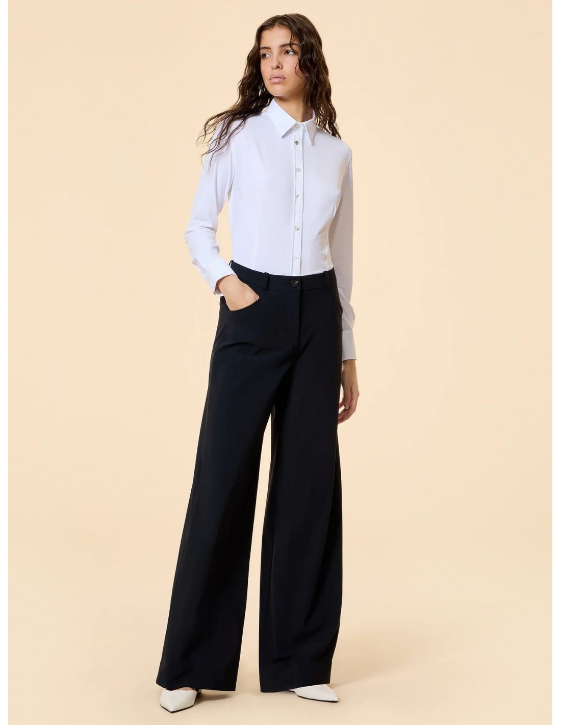 Confeccionada en tejido Oxford elástico de alta calidad, ofrece una textura ligera, suave y flexible, garantizando comodidad durante todo el día. Su diseño entallado realza de forma natural la silueta femenina, aportando un equilibrio perfecto entre estructura y fluidez.
