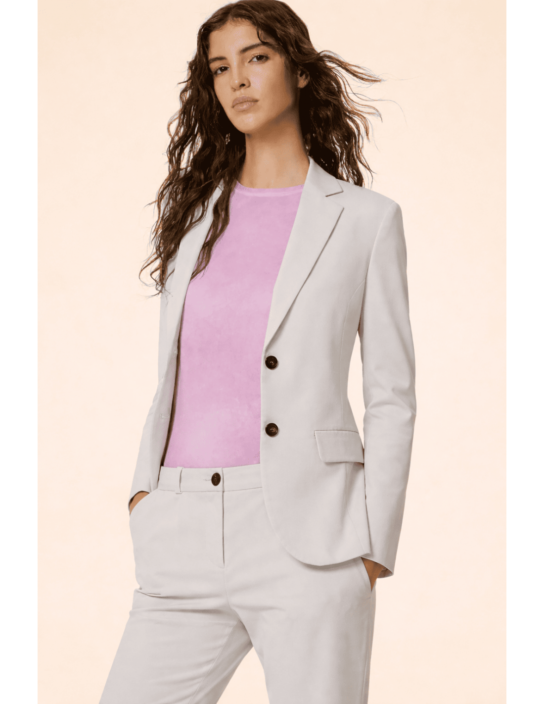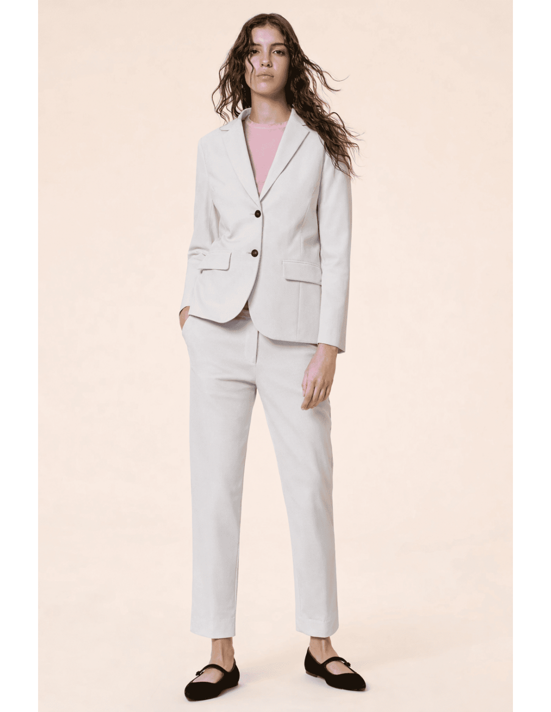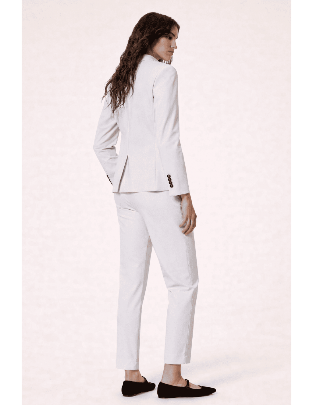 Su silueta entallada realza la figura con naturalidad, aportando un estilo sofisticado y femenino. Los botones efecto cuerno y las solapas de los bolsillos añaden un toque sartorial refinado, elevando el diseño con detalles discretos pero distintivos.
