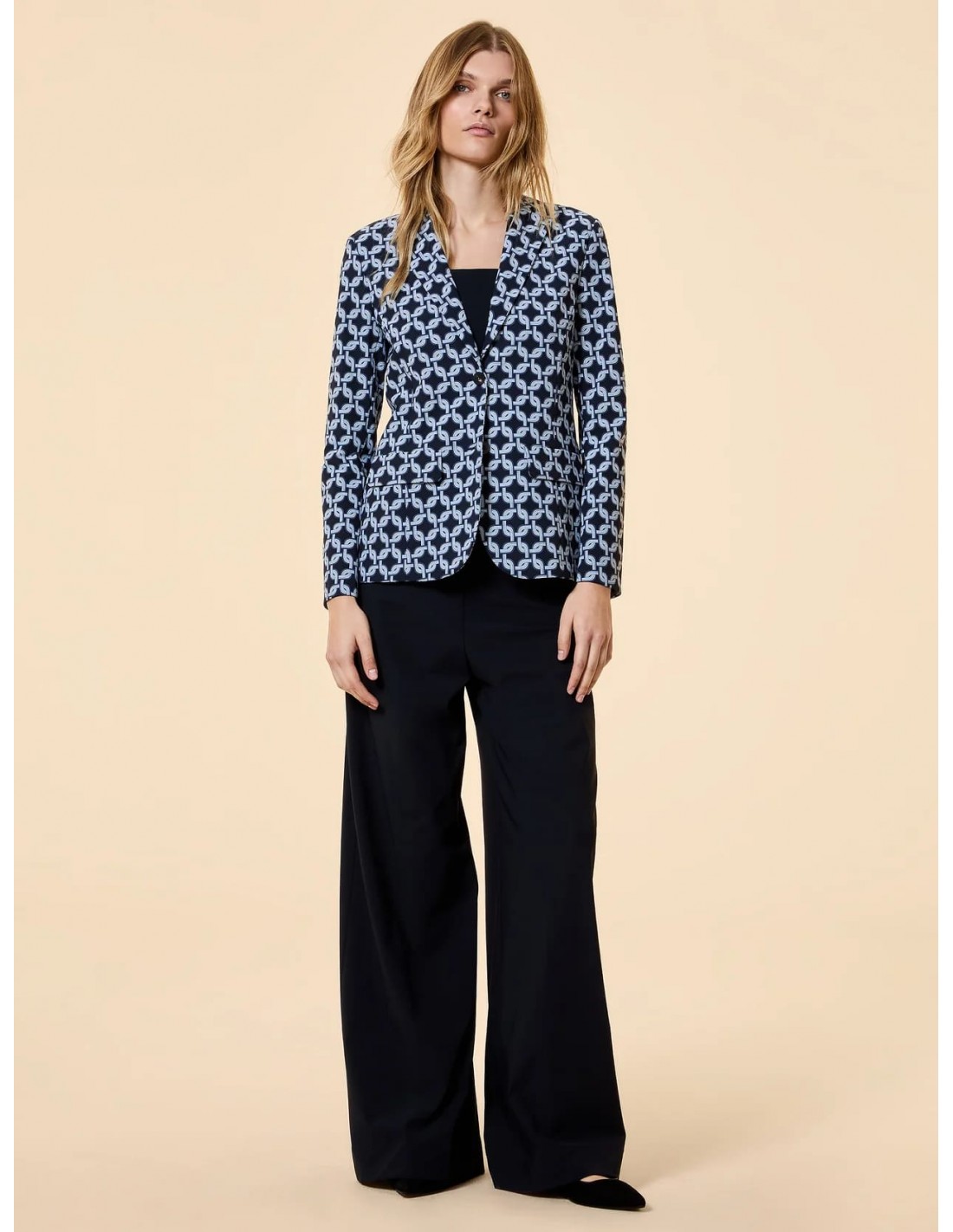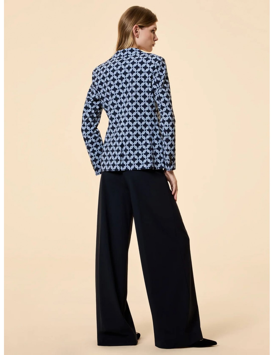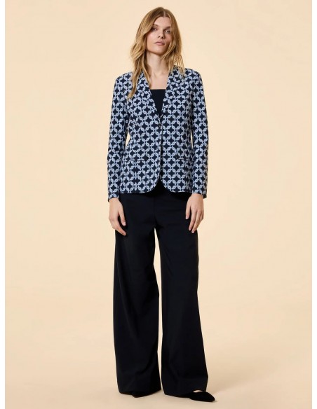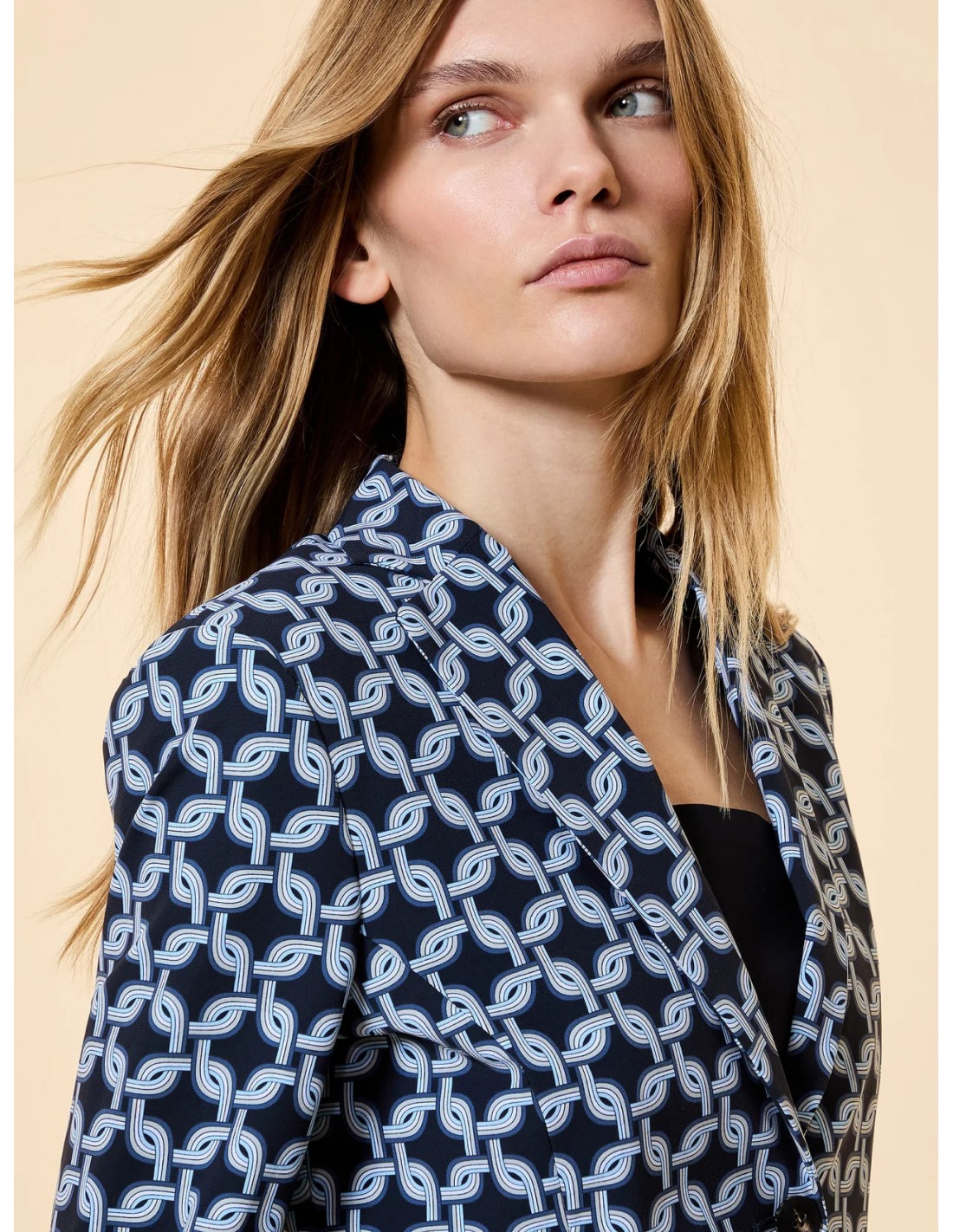 Atrévete con un blazer femenino que combina diseño moderno y elegancia sofisticada. Esta americana estampada con print de cadenas, inspirada en el estilo chic de los años 70, se convierte en una pieza clave para elevar cualquier look con personalidad y carácter.
