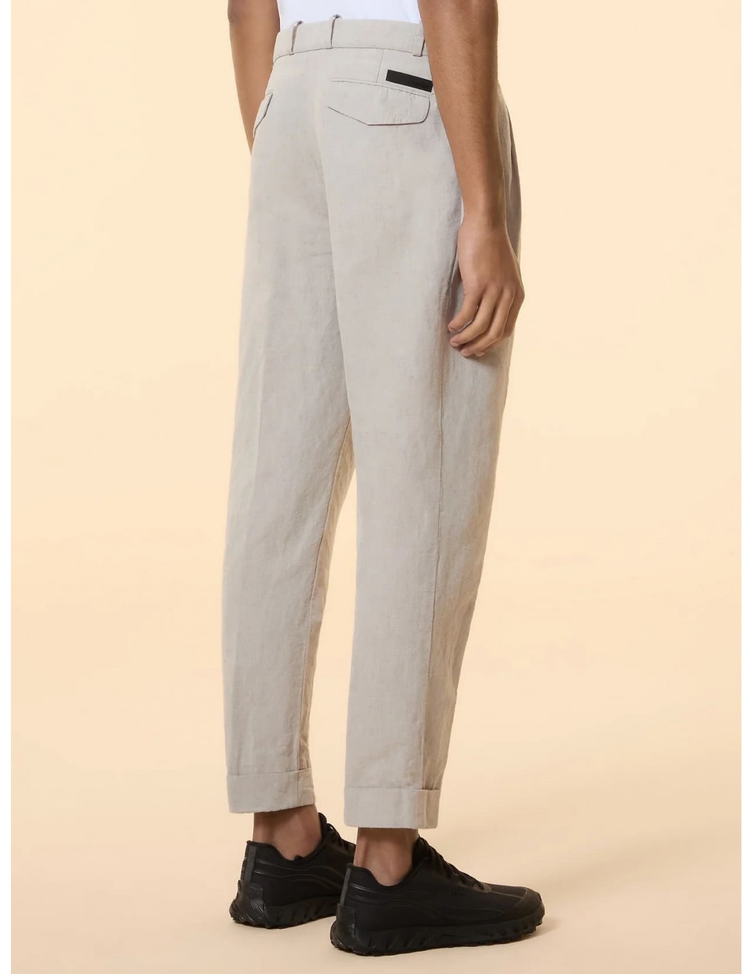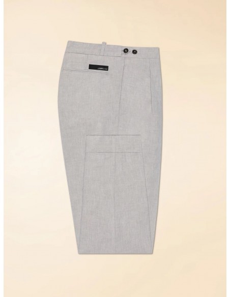 Las dos pinzas frontales aportan una silueta estructurada y un ajuste cómodo que se adapta al movimiento, ofreciendo un equilibrio perfecto entre funcionalidad y elegancia. La cintura con trabillas, ajustable mediante botones de cuerno y tiradores laterales, añade un detalle sartorial clásico que refuerza su carácter exclusivo.