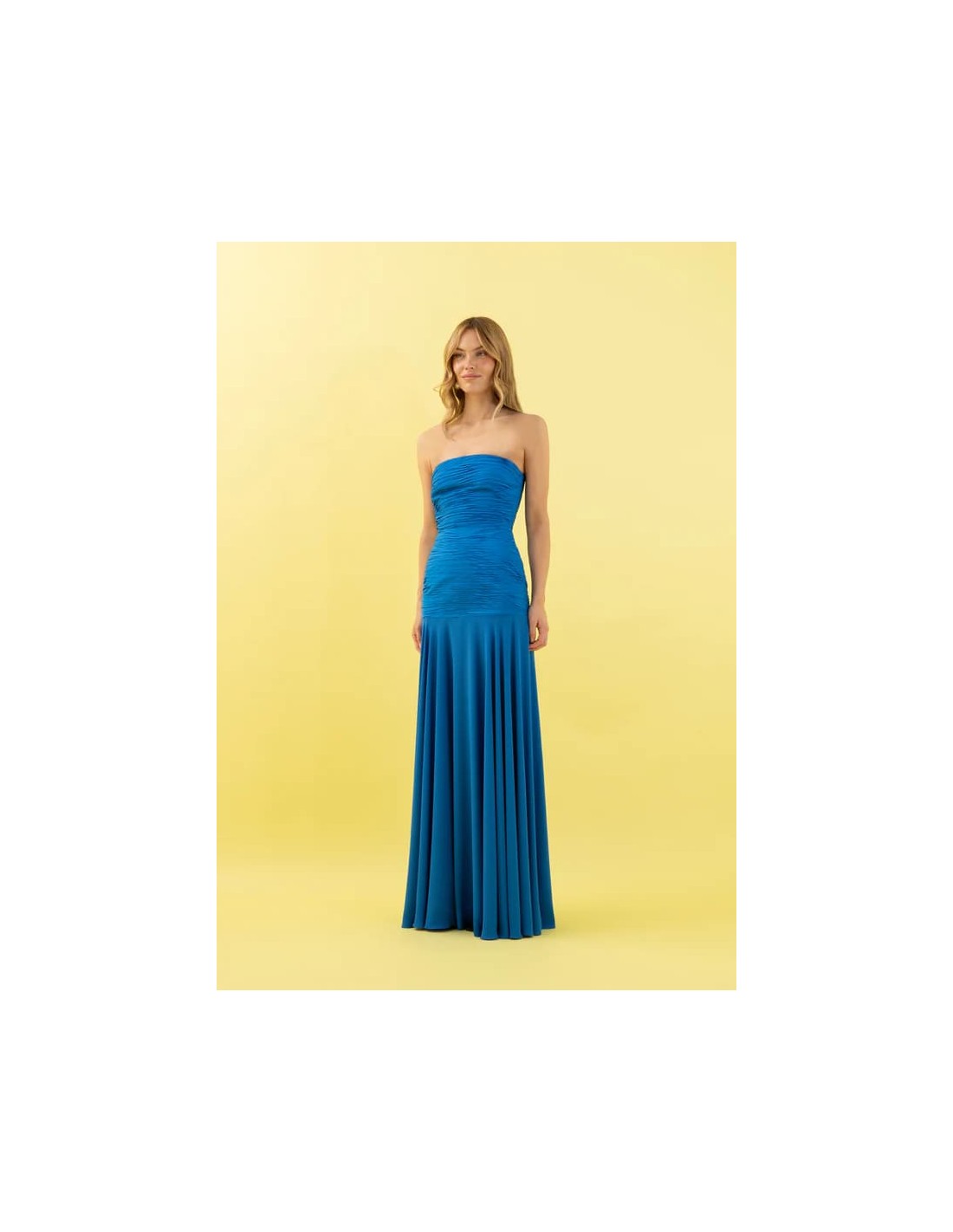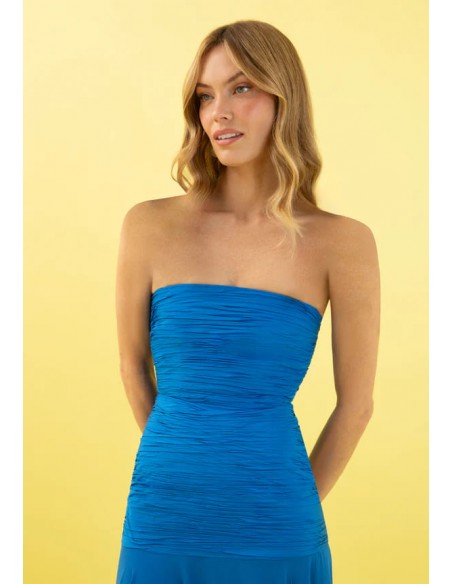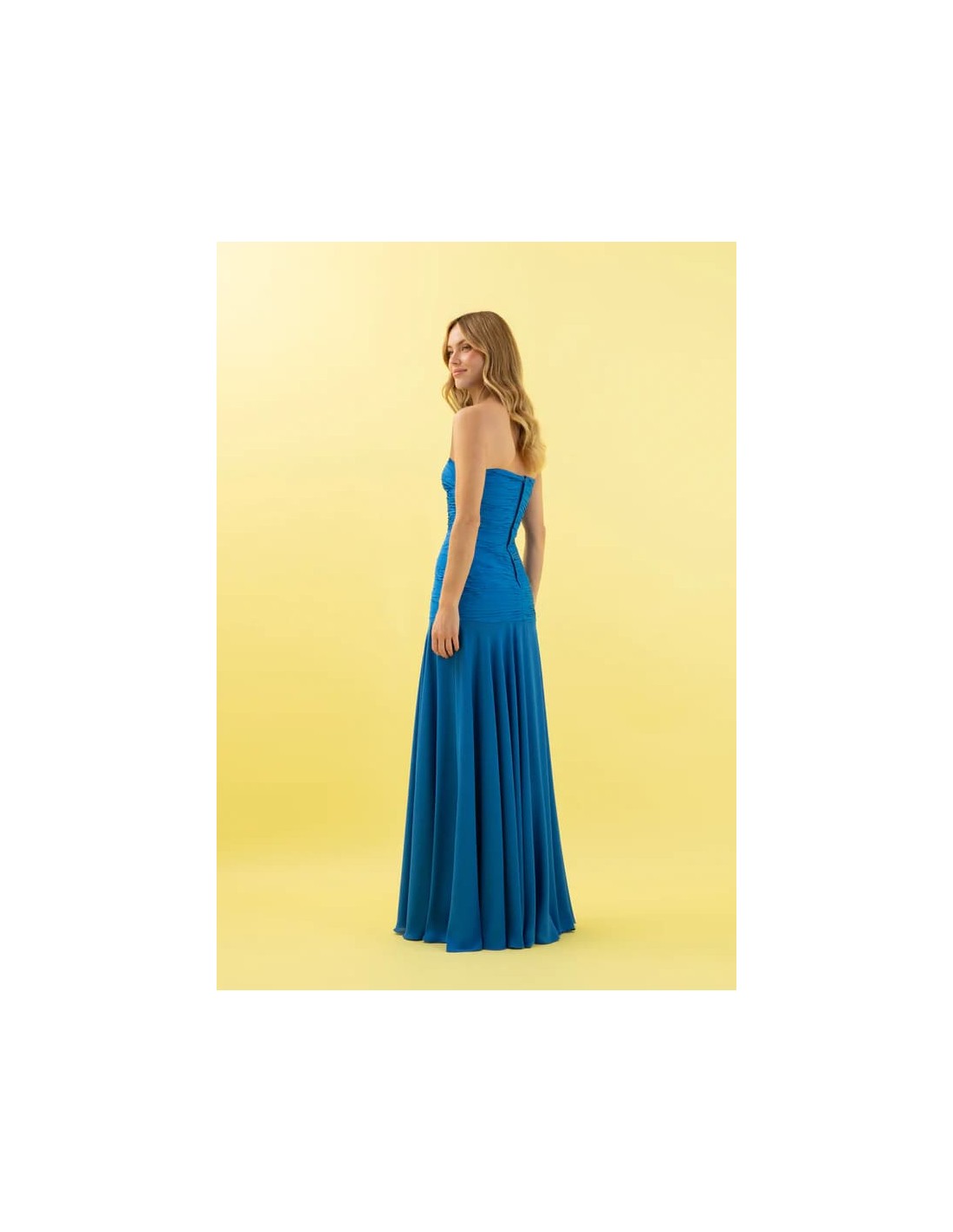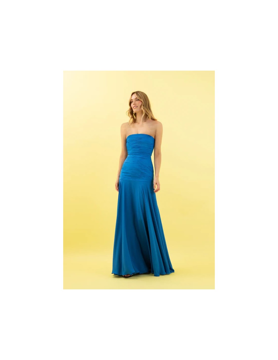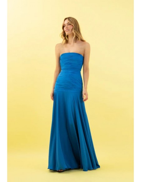 Descubre este vestido palabra de honor, una pieza sofisticada y femenina que destaca por su diseño cuidado y su confección artesanal. El cuerpo, completamente drapeado a mano en tafetán de seda, aporta estructura, elegancia y un acabado exclusivo que realza la silueta.