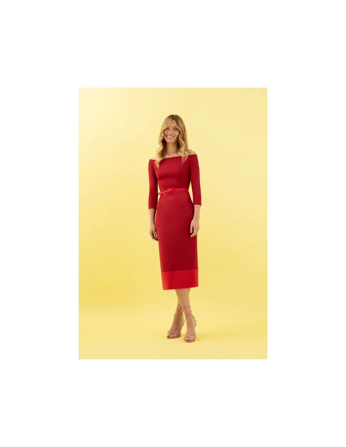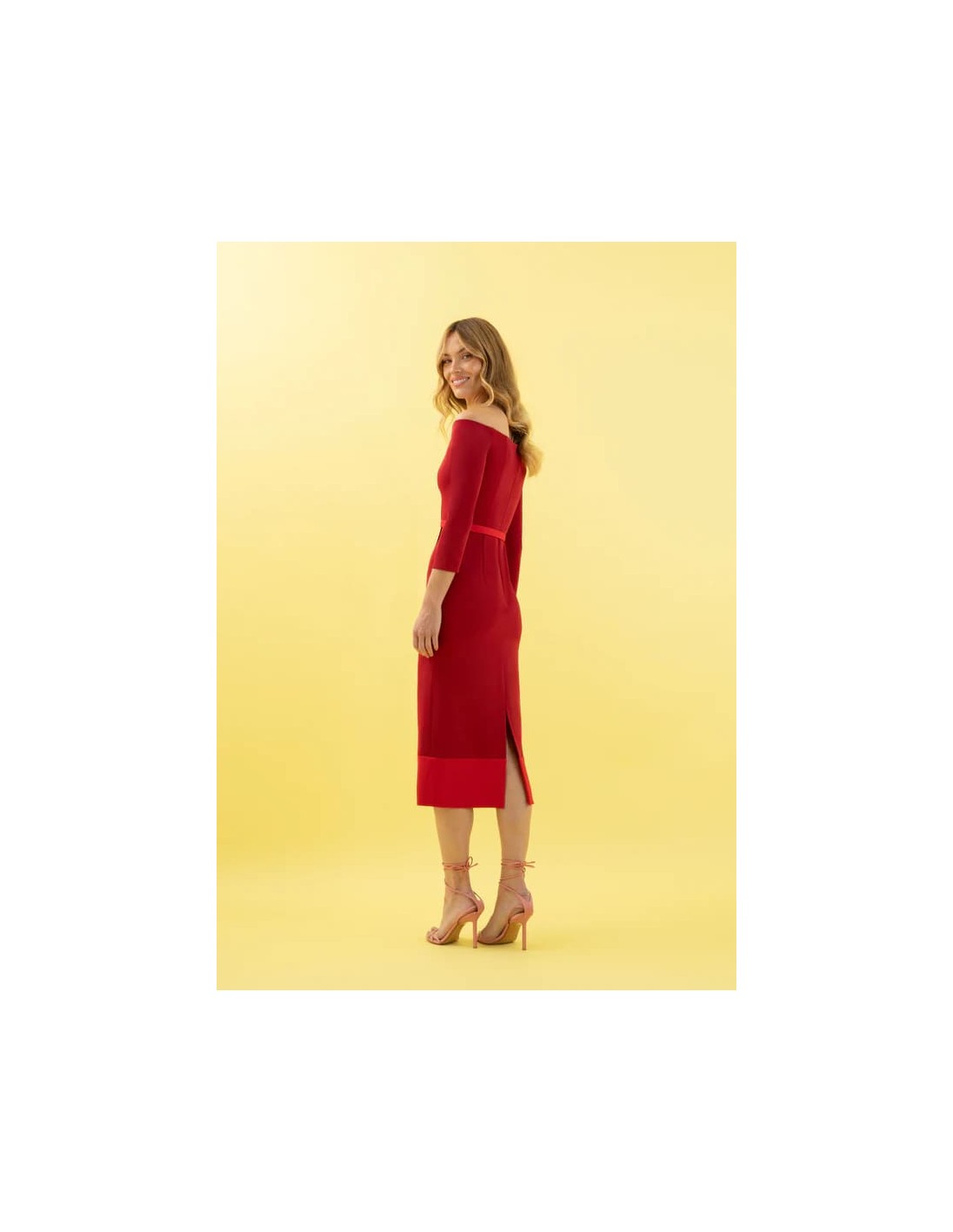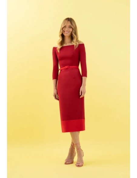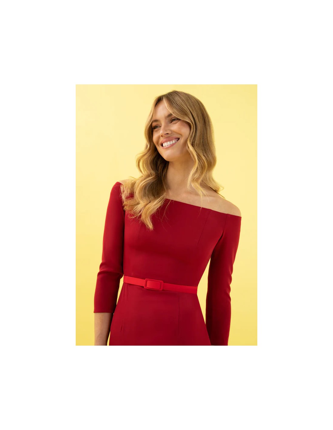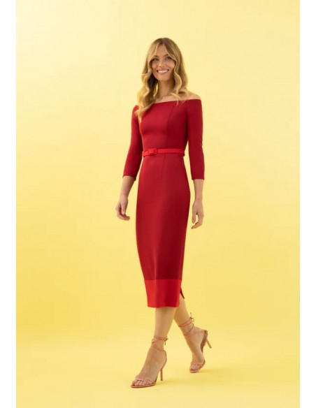 Descubre este vestido de crepé con escote bardot, una prenda elegante y femenina que destaca por su diseño atemporal y sofisticado. El escote con hombros descubiertos aporta un toque romántico, mientras que la manga francesa equilibra el look con un aire refinado.