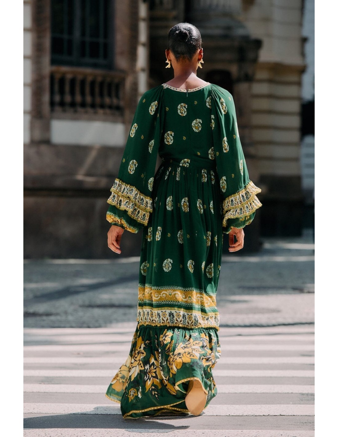 La silueta larga y fluida se complementa con delicados volantes en las mangas y el bajo, creando movimiento y un efecto femenino y sofisticado en cada paso. El escote en V realza la figura de forma sutil, aportando un toque favorecedor y elegante.