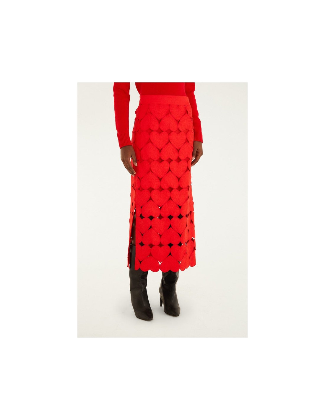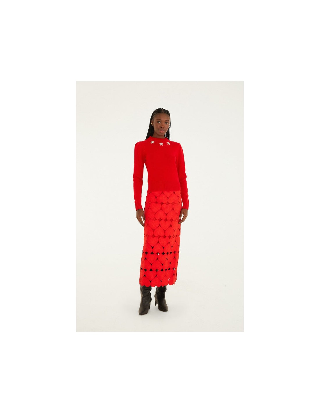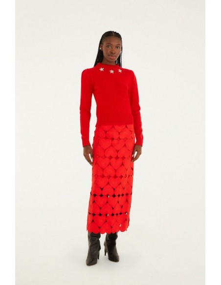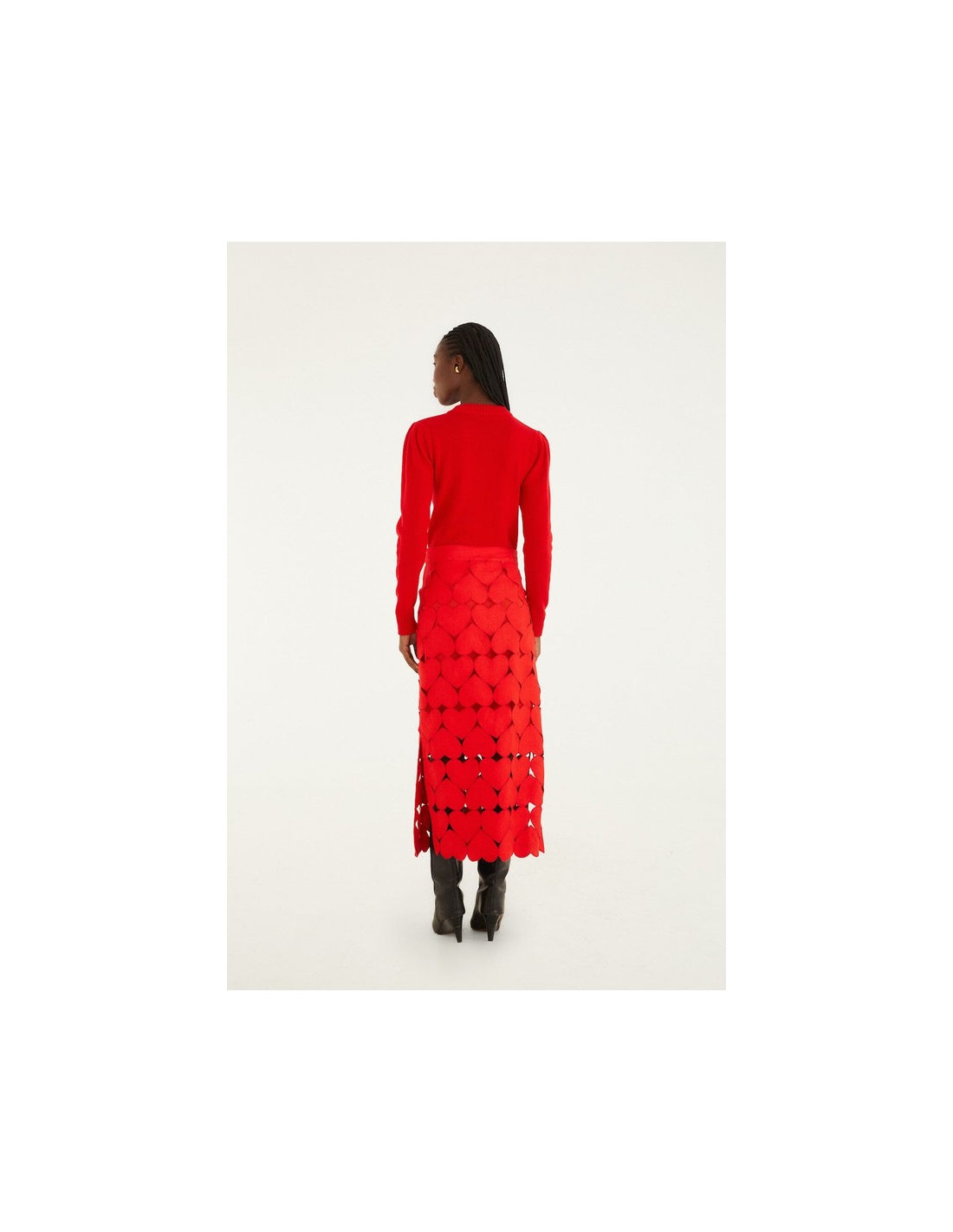 Su base en tono rojo intenso, decorada con divertidos motivos de corazones, aporta un aire alegre y distintivo que eleva cualquier look. La silueta midi, fluida y favorecedora, se adapta suavemente al cuerpo, mientras que los sutiles pliegues añaden movimiento y elegancia en cada paso.