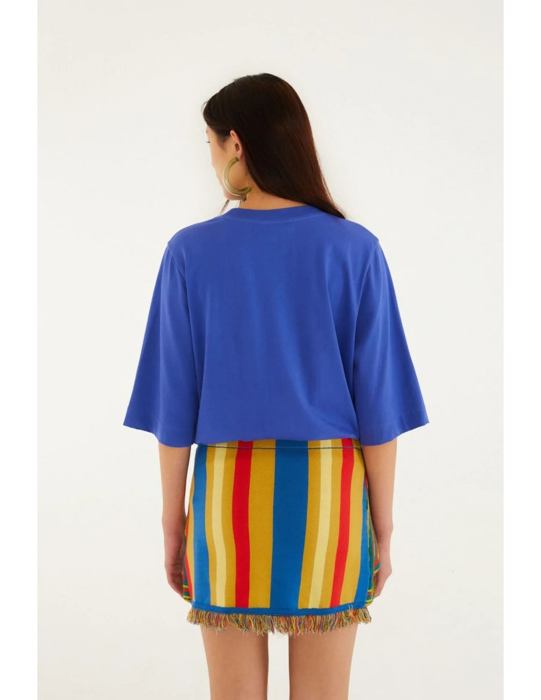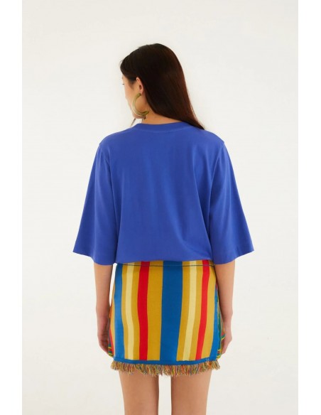 Su corte boxy ofrece un ajuste relajado y cómodo, ideal para el día a día. Ligera y versátil, es perfecta para combinar con jeans, faldas o shorts, creando looks casuales con un toque distintivo.