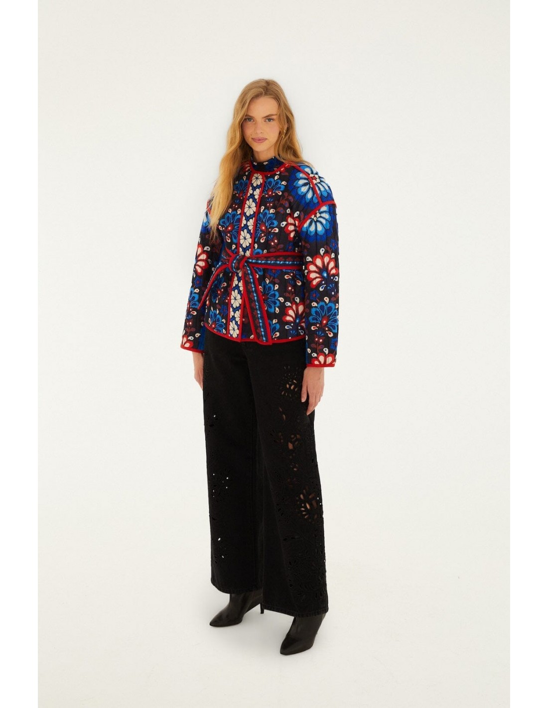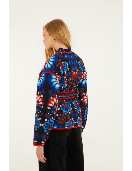 Descubre esta chaqueta estampada, una prenda única que combina color, diseño artístico y un estilo sofisticado con un toque contemporáneo. Su vibrante estampado floral en tonos azules, rojos y blancos sobre fondo oscuro aporta personalidad y convierte cualquier look en una declaración de estilo.