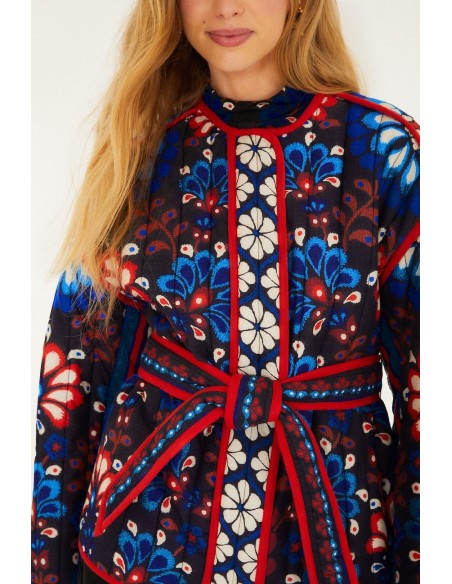 El diseño se realza con detalles en contraste en color rojo que recorren los bordes y costuras, aportando estructura y un acabado distintivo. Su silueta ligeramente entallada se ajusta mediante un cinturón del mismo tejido, permitiendo definir la figura de forma elegante y femenina.