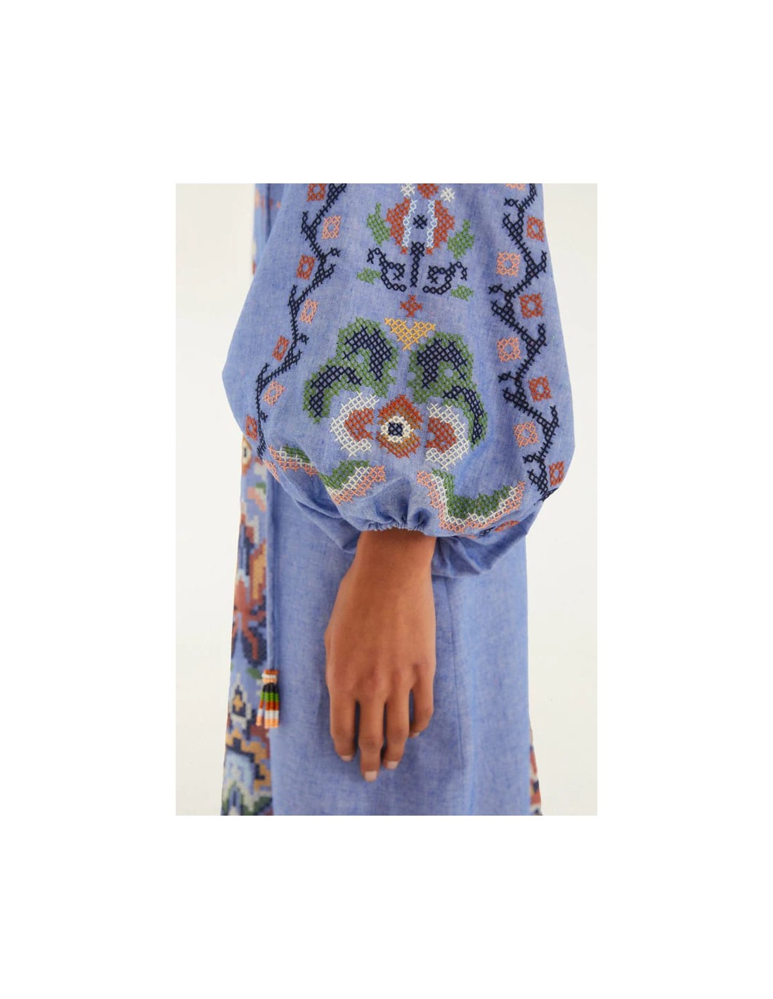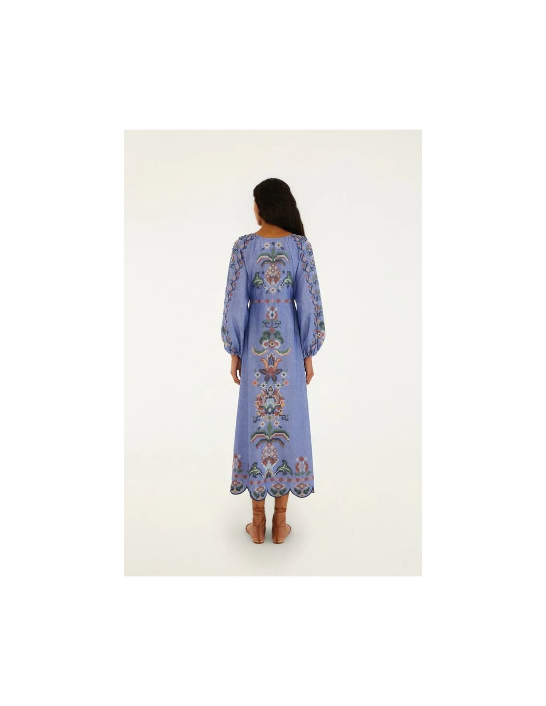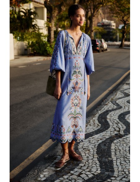 Descubre este vestido midi bordado de FARM Rio, una prenda que refleja la esencia vibrante y colorida de la marca, inspirada en su herencia brasileña. Su diseño combina artesanía y estilo contemporáneo, convirtiéndolo en una pieza única y llena de personalidad.