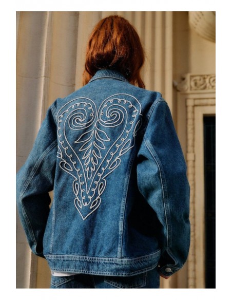 Confeccionada en denim 100% algodón, esta chaqueta destaca por sus bordados de corazones, que aportan un toque romántico y distintivo. Una reinterpretación del clásico vaquero con un aire boho-chic moderno, perfecta para elevar cualquier look.