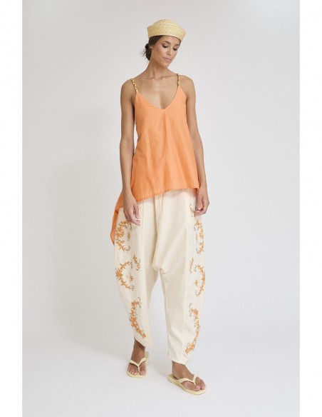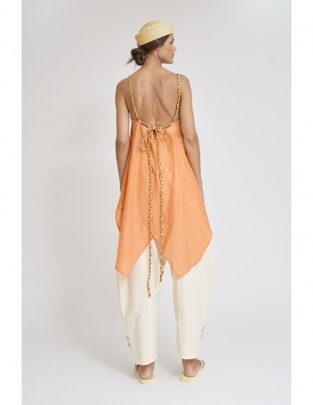 Este top de tirantes trenzados en varios colores está confeccionado en una delicada mezcla de seda y algodón, ofreciendo una textura suave y fresca ideal para los días más cálidos. Su diseño destaca por los tirantes trenzados, que aportan un toque artesanal y diferenciador.