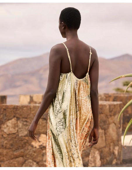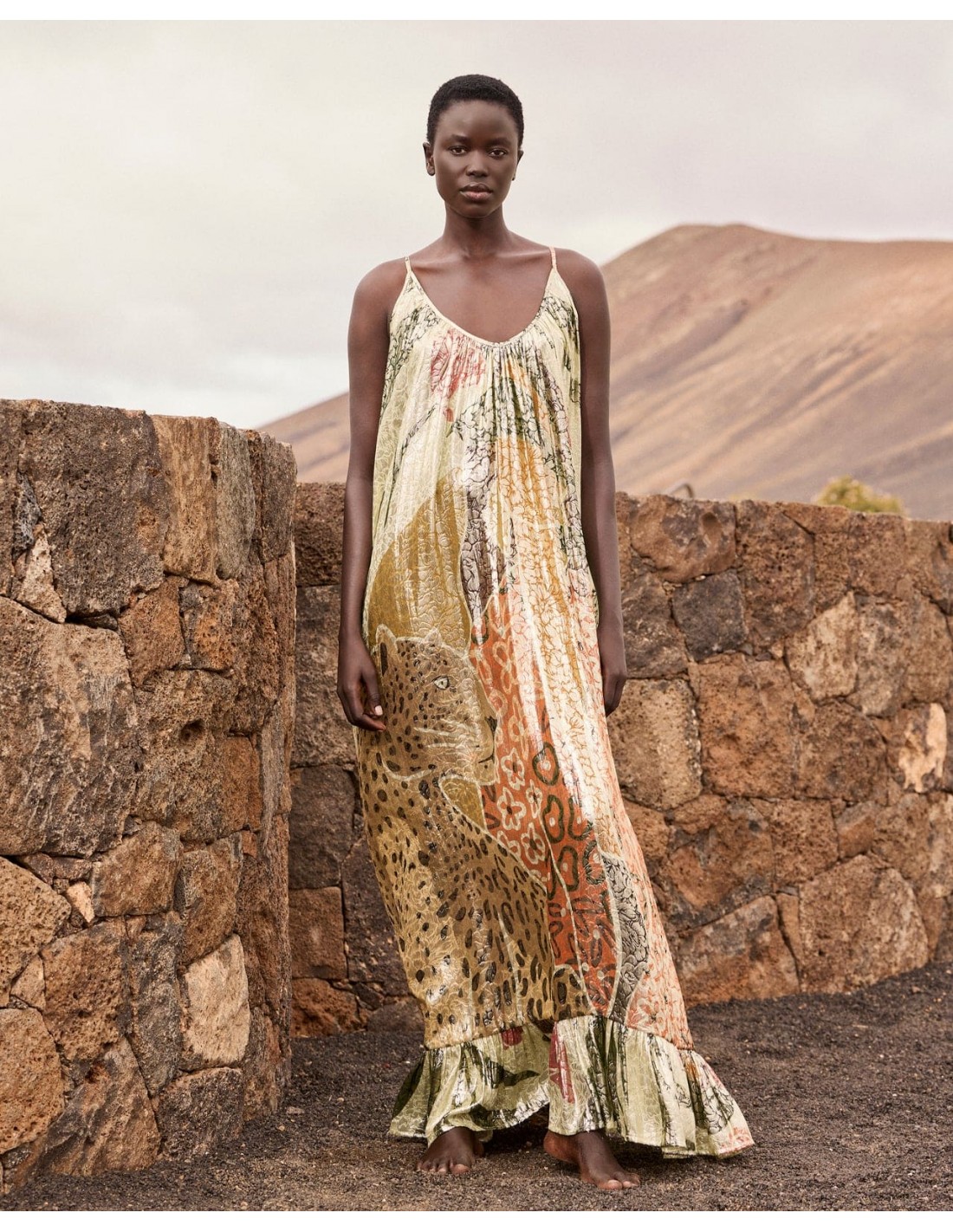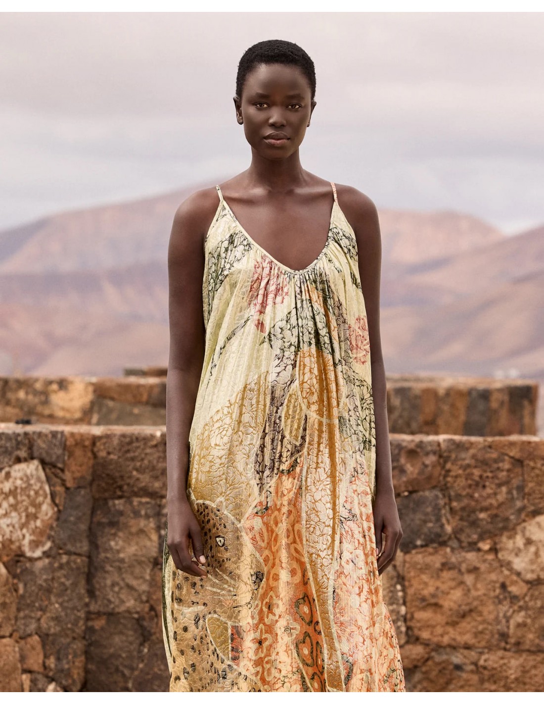 Descubre este vestido largo confeccionado en jacquard lurex metalizado multicolor, que aporta un efecto brillante y texturizado con un acabado ligeramente “wet” y luminoso. Su corte fluido y ligero se realza con un volante en el bajo y finos tirantes ajustables, creando una silueta femenina y elegante. El delicado plisado potencia el movimiento y refleja la luz en cada paso.