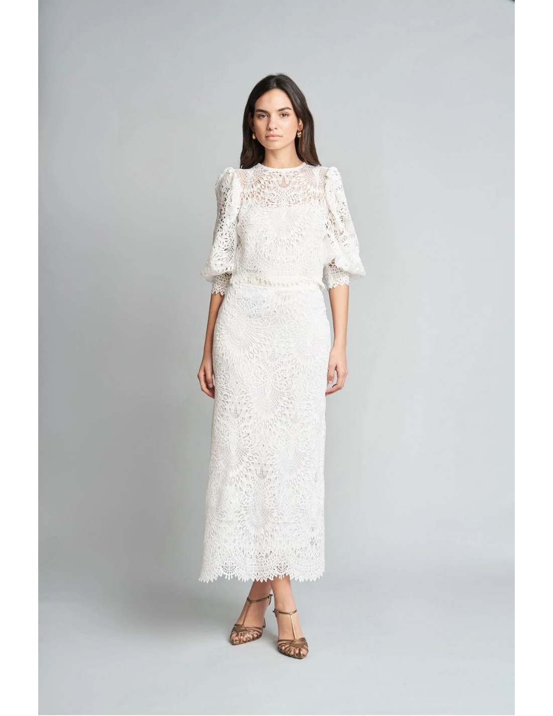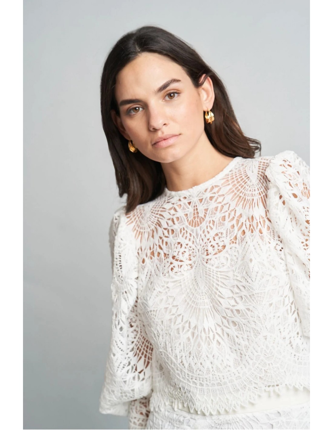 Descubre esta camisa confeccionada en tejido guipur con motivo floral, una prenda delicada que combina elegancia y carácter. Su diseño destaca por las mangas abullonadas al codo, que aportan volumen y un aire romántico, junto con un cuello redondo y un corte que realza la silueta de forma favorecedora.