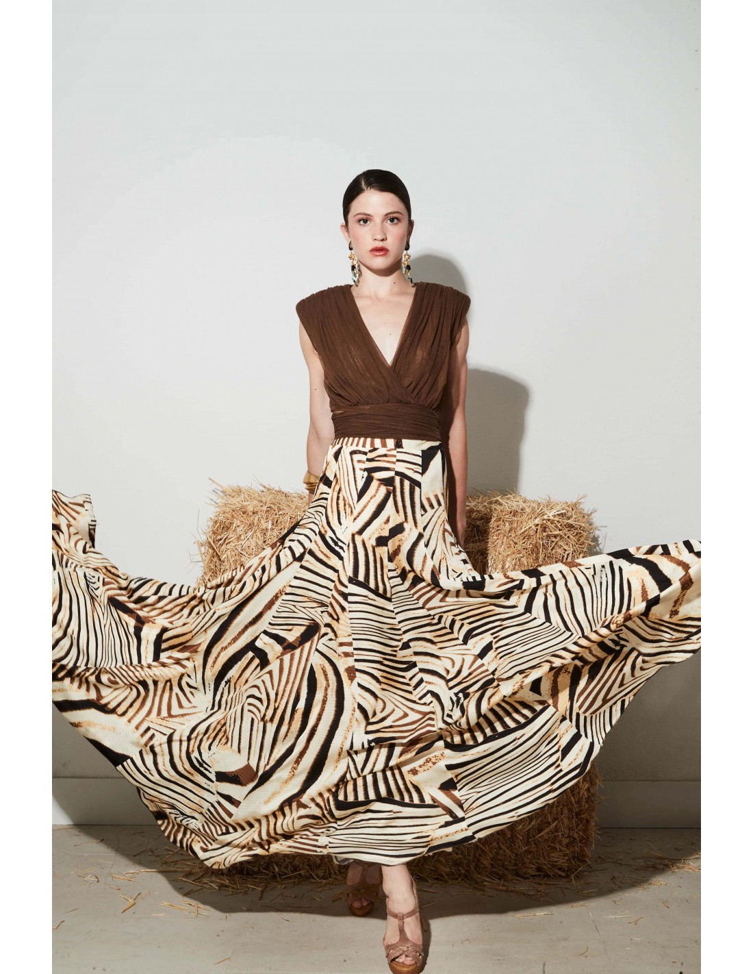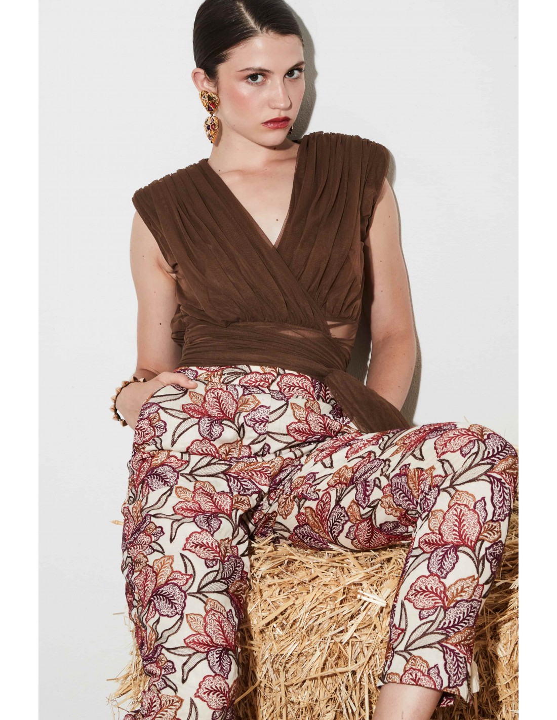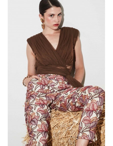 Descubre esta camisa de tul en color marrón, una prenda ligera y elegante diseñada para adaptarse a diferentes estilos. Su diseño multiposición permite llevarla con el escote cruzado tanto en la parte delantera como en la espalda, ofreciendo dos looks en una sola pieza. Las hombreras aportan estructura y realzan la silueta con un toque moderno.