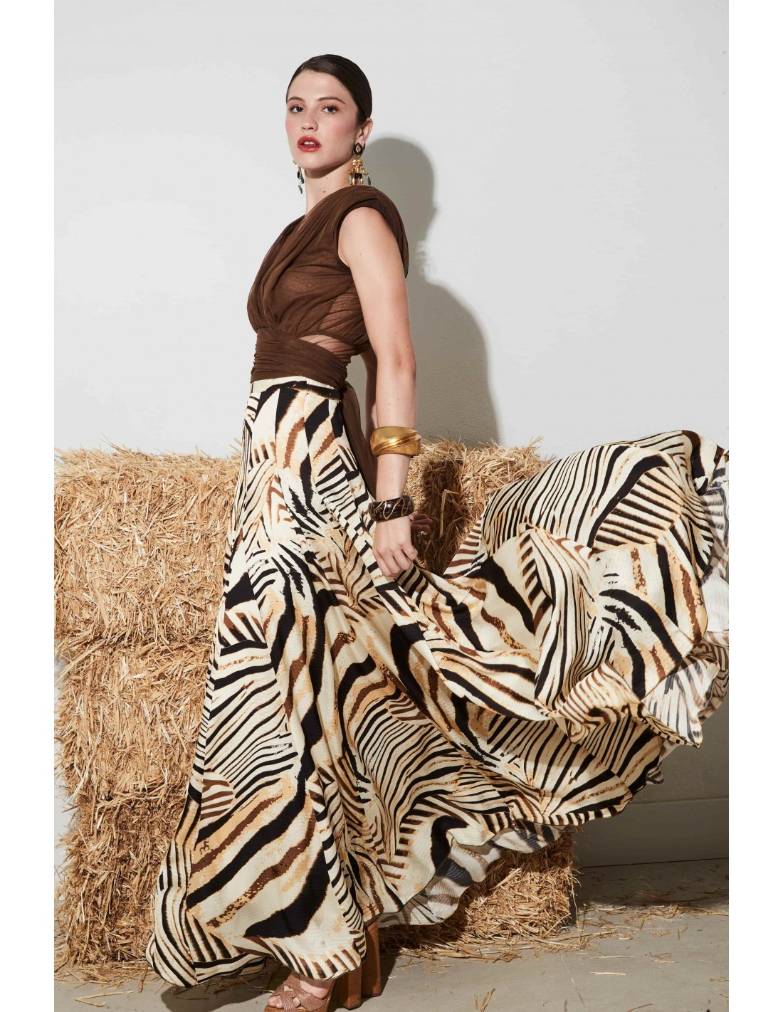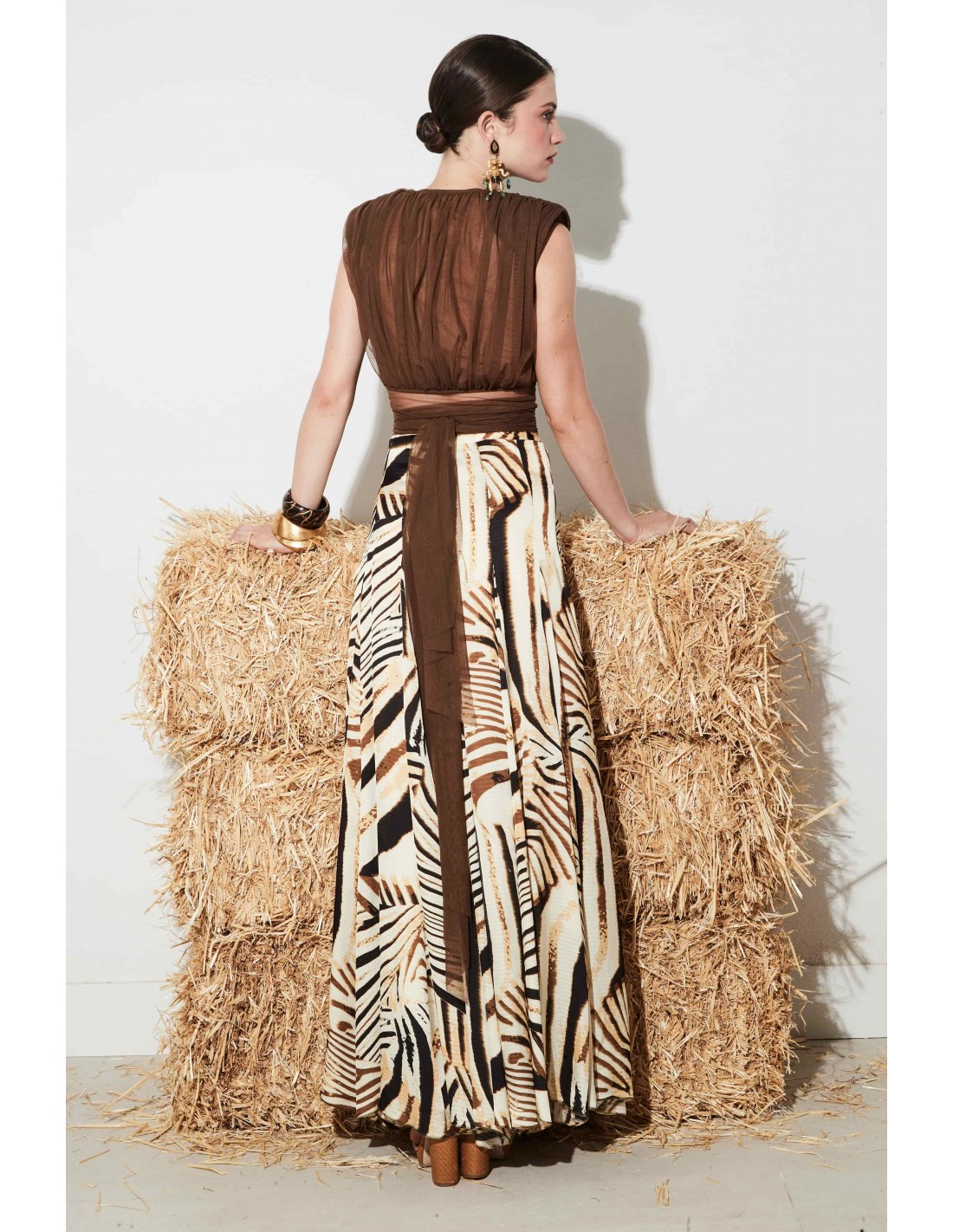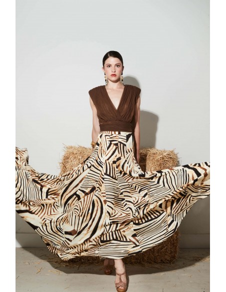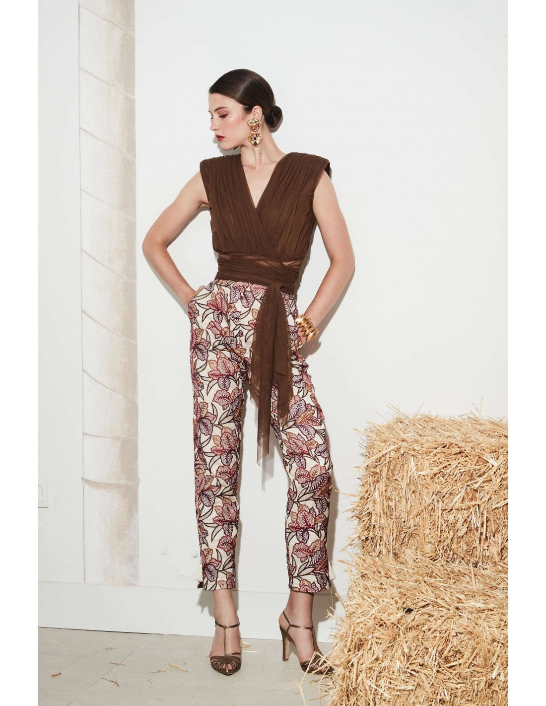 Descubre esta camisa de tul en color marrón, una prenda ligera y elegante diseñada para adaptarse a diferentes estilos. Su diseño multiposición permite llevarla con el escote cruzado tanto en la parte delantera como en la espalda, ofreciendo dos looks en una sola pieza. Las hombreras aportan estructura y realzan la silueta con un toque moderno.