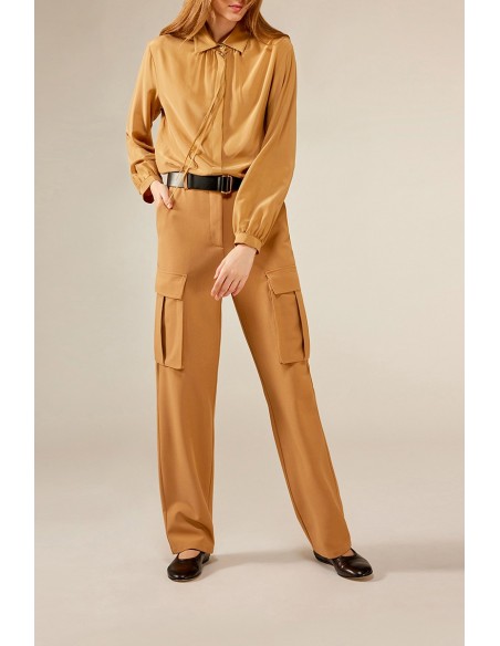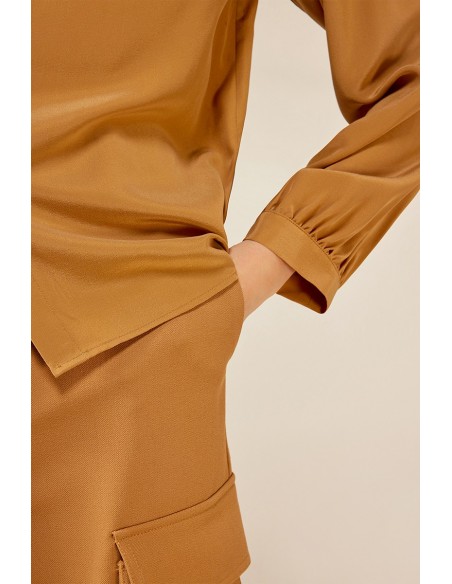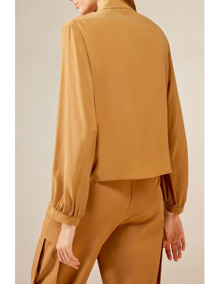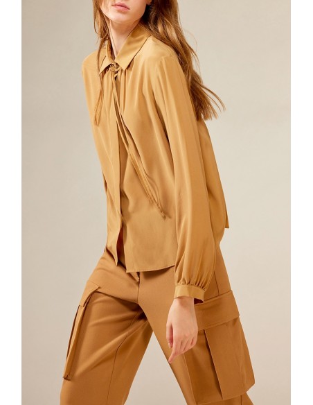 Sumérgete en la elegancia con nuestra camisa de seda, que presenta un refinado cuello y un cordón en el escote para un toque de versatilidad. Los hombros caídos y las mangas voluminosas en la parte inferior crean una silueta única que captura la atención. Con un ajuste regular, esta camisa combina comodidad y estilo de manera perfecta.