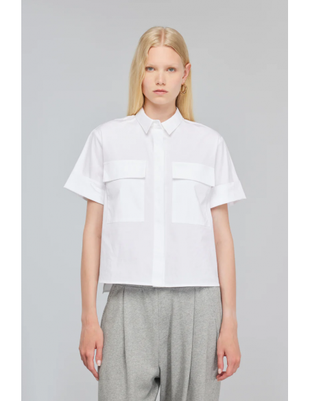 La camisa Elea de Semicouture es una prenda sofisticada y contemporánea confeccionada en popelina elástica. Su corte a la cintura y manga corta con vuelta aportan una estética casual chic, mientras que las dos bolsillos con solapa añaden funcionalidad con estilo. En la parte trasera, un delicado pliegue central incorpora un inserto de organza de seda, que eleva la prenda con un toque inesperado y etéreo. Los botones frontales de nácar completan este diseño refinado. Perfecta para un look elegante con carácter, tanto en la oficina como en salidas informales.
