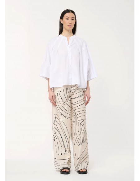 La camisa over blanca es una prenda versátil y contemporánea, perfecta para looks relajados pero con carácter. Confeccionada en popelín liso 100% algodón, su diseño oversize ofrece una silueta fluida con un volumen generoso que aporta comodidad sin perder estilo. Destaca por su escote mao con delicadas pinzas frontales que aportan estructura, y sus mangas cortas que la hacen ideal para los días cálidos. Su largo de 62 cm permite llevarla tanto por fuera como por dentro del pantalón o la falda.