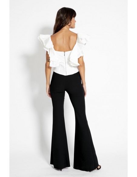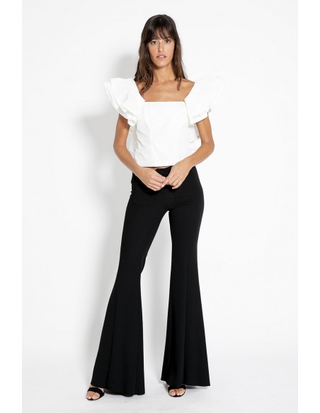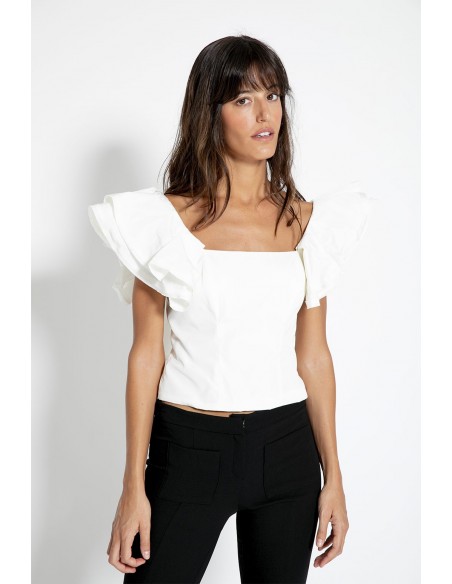 Un básico ideal para las fiestas, este top confeccionado en tafetán creando una prenda con un tacto y un estilo impecables. Como elemento diferenciador cuenta con unos volantes en los hombros que le aportan un toque llamativo en la prenda.