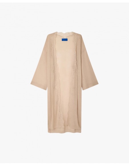 Su corte recto y amplio aporta una silueta relajada y femenina, perfecta para un estilo sofisticado sin esfuerzo. Los acabados en encaje tono sobre tono recorren toda la abertura y el cuello, añadiendo un toque delicado y romántico.