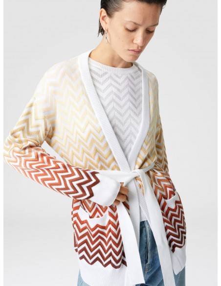 Los detalles de ribetes en contraste añaden un toque moderno, mientras que el cinturón en la cintura define la silueta con elegancia. Los dos bolsillos delanteros aportan practicidad sin sacrificar el estilo, manteniendo la esencia sofisticada que define a Missoni.