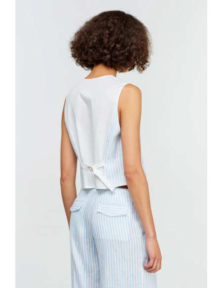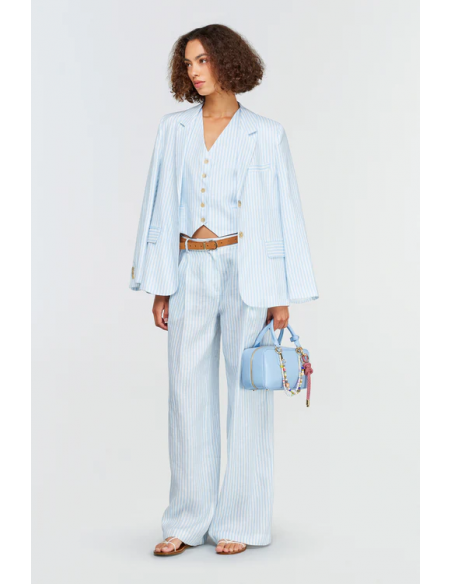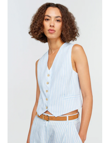 El chaleco Georgia de Semicouture aporta un toque de elegancia fresca y desenfadada. Confeccionado en lino con estampado de rayas, presenta un escote en V que estiliza el torso y una botonadura frontal que permite lucirlo abierto o cerrado. Sus dos bolsillos con vivo añaden funcionalidad sin perder estilo. Con un largo a la cintura y corte regular, es una prenda ideal para llevar sola o en superposición, tanto en conjuntos informales como en estilismos más sofisticados. Perfecto para combinar con su pantalón a juego o con denim para un look de verano contemporáneo.