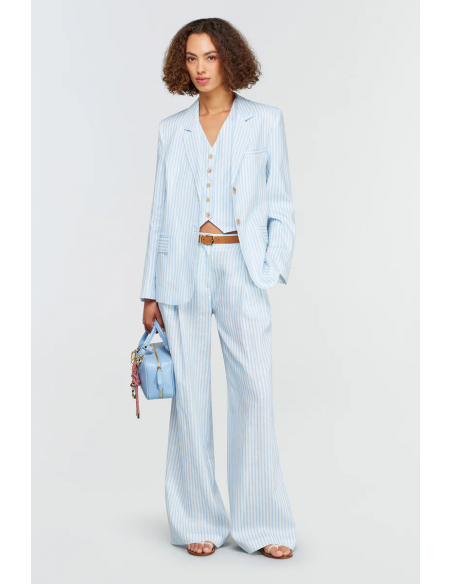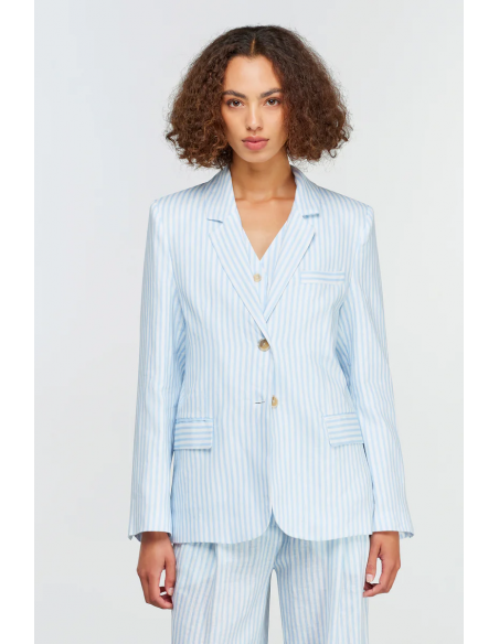 La blazer Juanita de Semicouture combina frescura y sofisticación en un diseño estructurado pero ligero. Confeccionada en lino con estampado de rayas, esta americana presenta un cuello con solapa clásica, cierre sencillo (single-breasted) y manga larga. Su corte regular y largo a la cadera la convierten en una prenda versátil, ideal para estilismos de oficina en verano o looks casual chic. Llévala con su chaleco y pantalón a juego para un conjunto coordinado, o combínala con prendas neutras para destacar su diseño limpio y elegante.