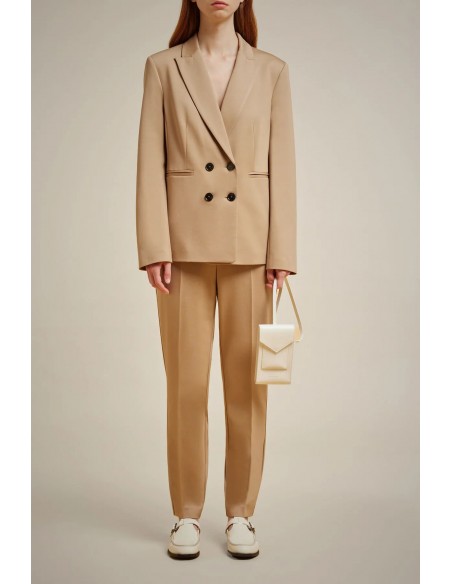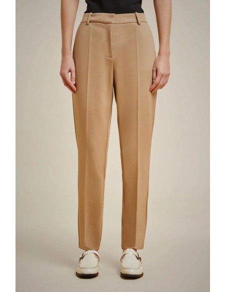Pantalones rectos de punto Milano brillante, cierre delantero con cremallera y botón oculto, cinturilla ancha con presillas, bolsillos franceses en la parte delantera y dobles bolsillos ribeteados en la parte trasera.