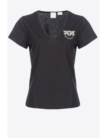 Este encantador top de algodón presenta un amplio escote de pico que añade un toque de sensualidad y estilo a tu look. En la parte izquierda del pecho, se encuentra un pequeño logotipo Love Birds bordado con strass y pequeñas tachuelas, que le confiere un toque de brillo y glamour. La combinación de elementos bordados y detalles brillantes agrega un encanto único a la prenda, elevando su estilo y haciéndola destacar.