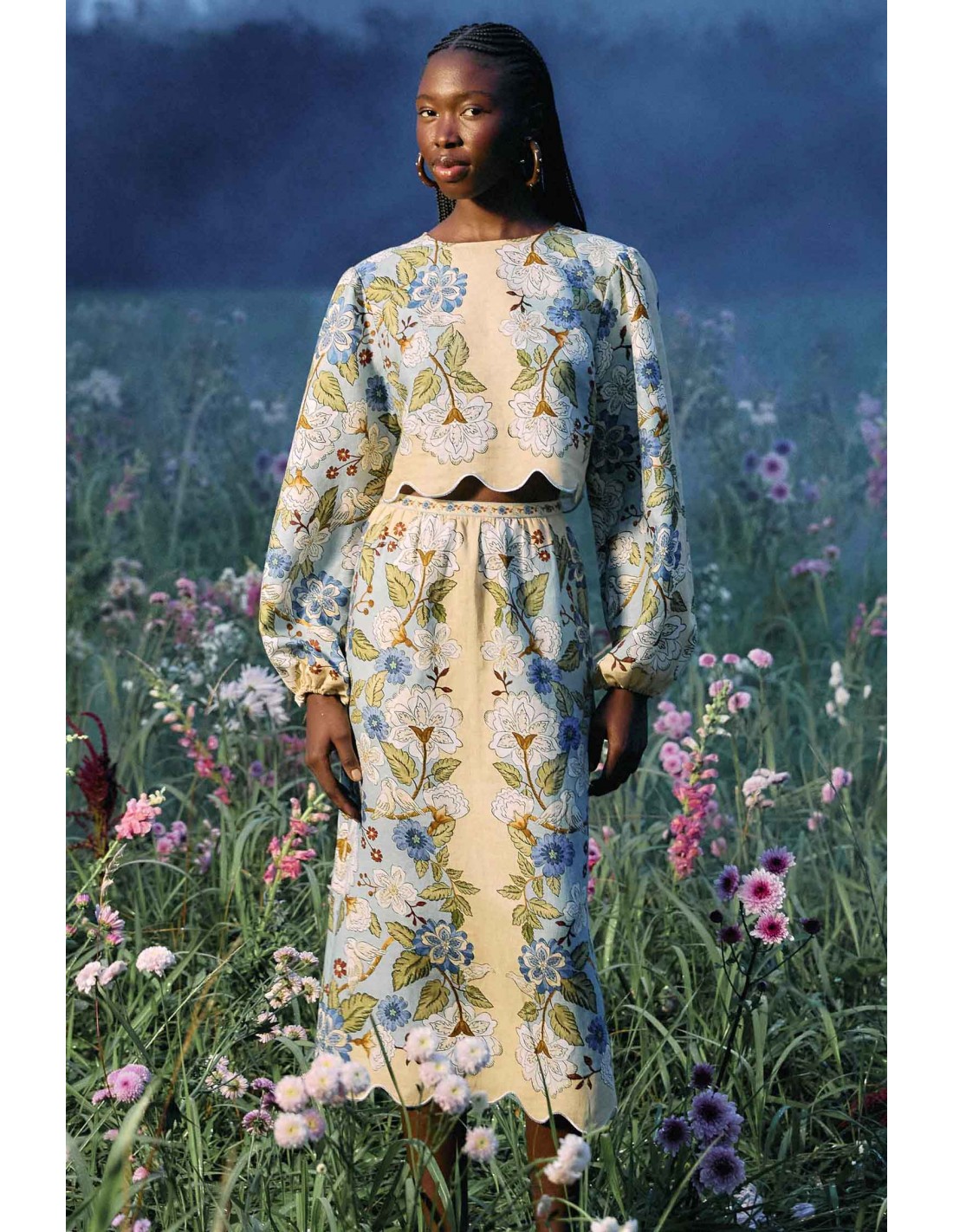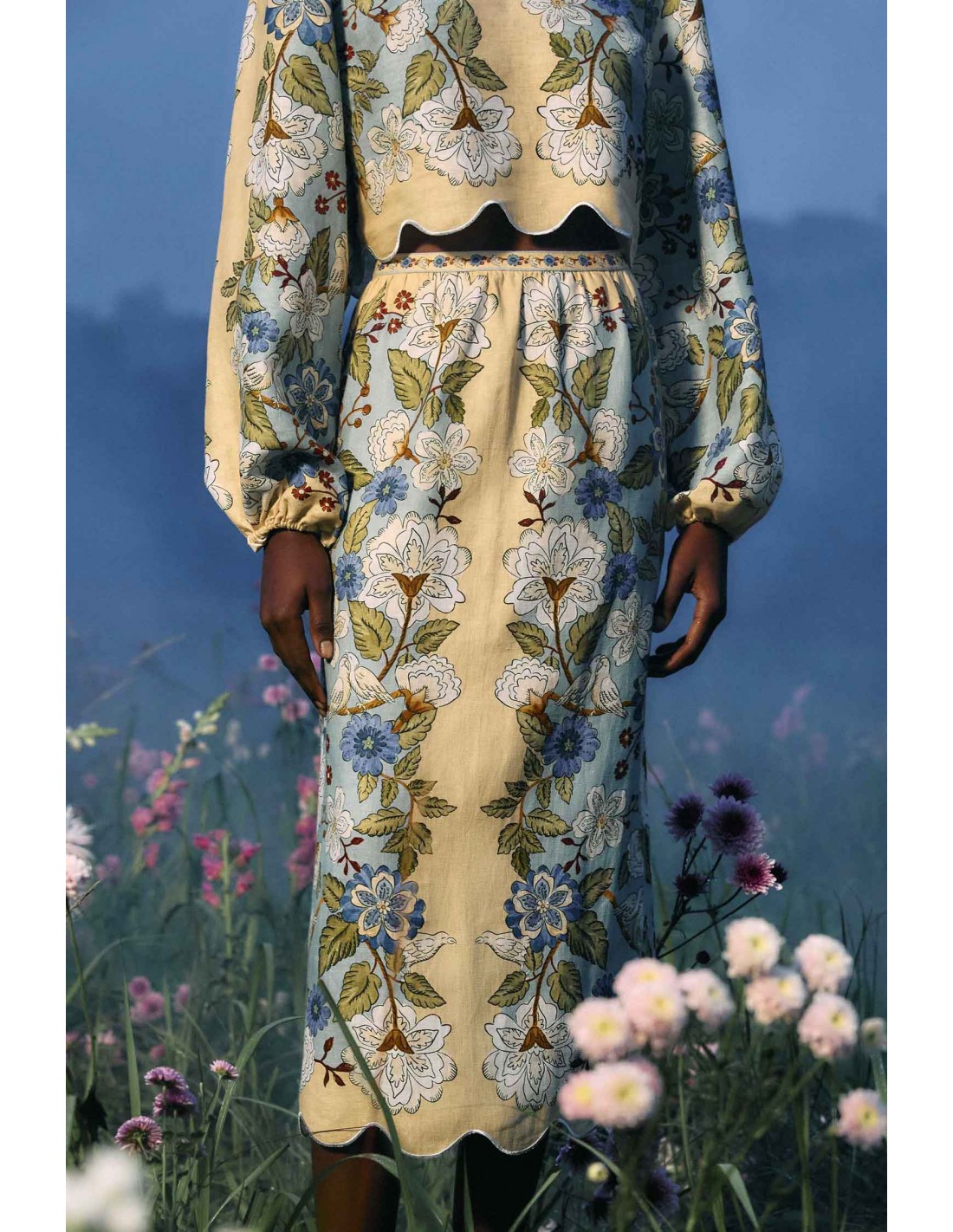 Descubre la falda midi Garden Scarf Blue de FARM Rio, una prenda vibrante y llena de color que aporta frescura y personalidad a cualquier look de verano. Confeccionada en lino 100%, destaca por su ligereza y movimiento natural, perfecta para los días más cálidos.