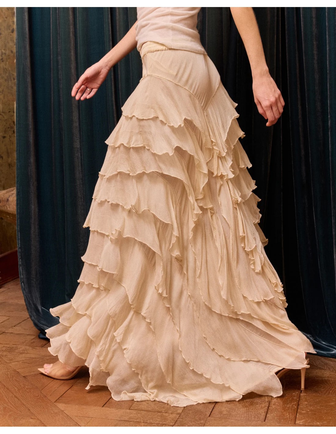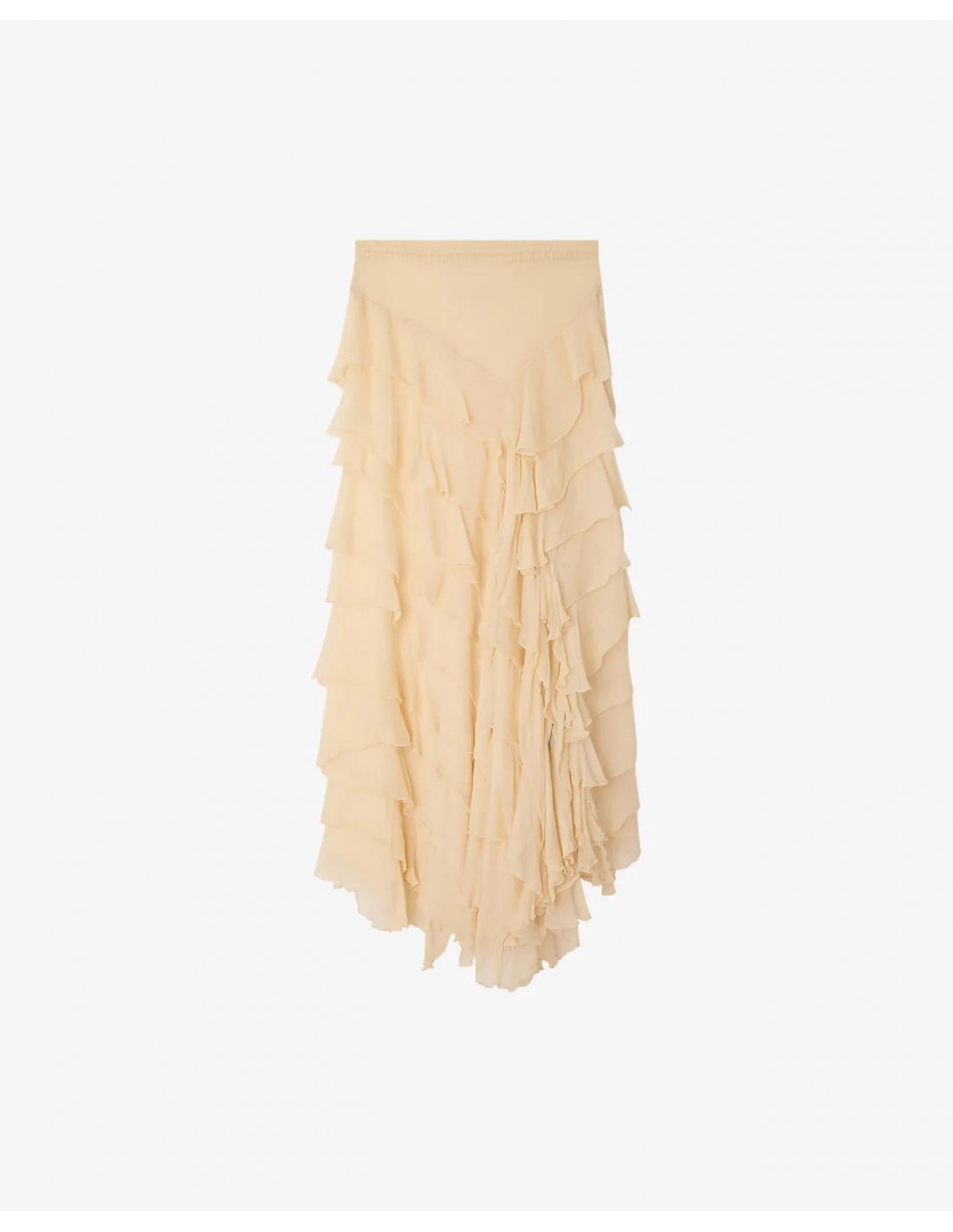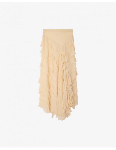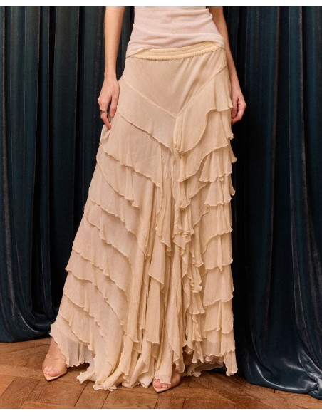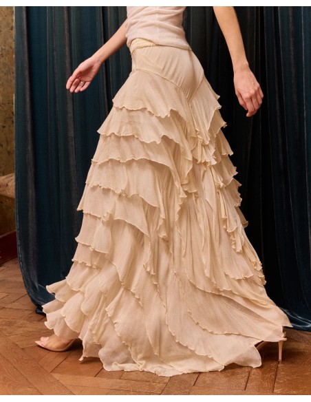 Descubre esta falda confeccionada en gasa de viscosa en tono crudo, una prenda ligera y etérea con un movimiento delicado en cada paso. Su caída fluida aporta un efecto elegante y dinámico, ideal para looks con un aire sofisticado.